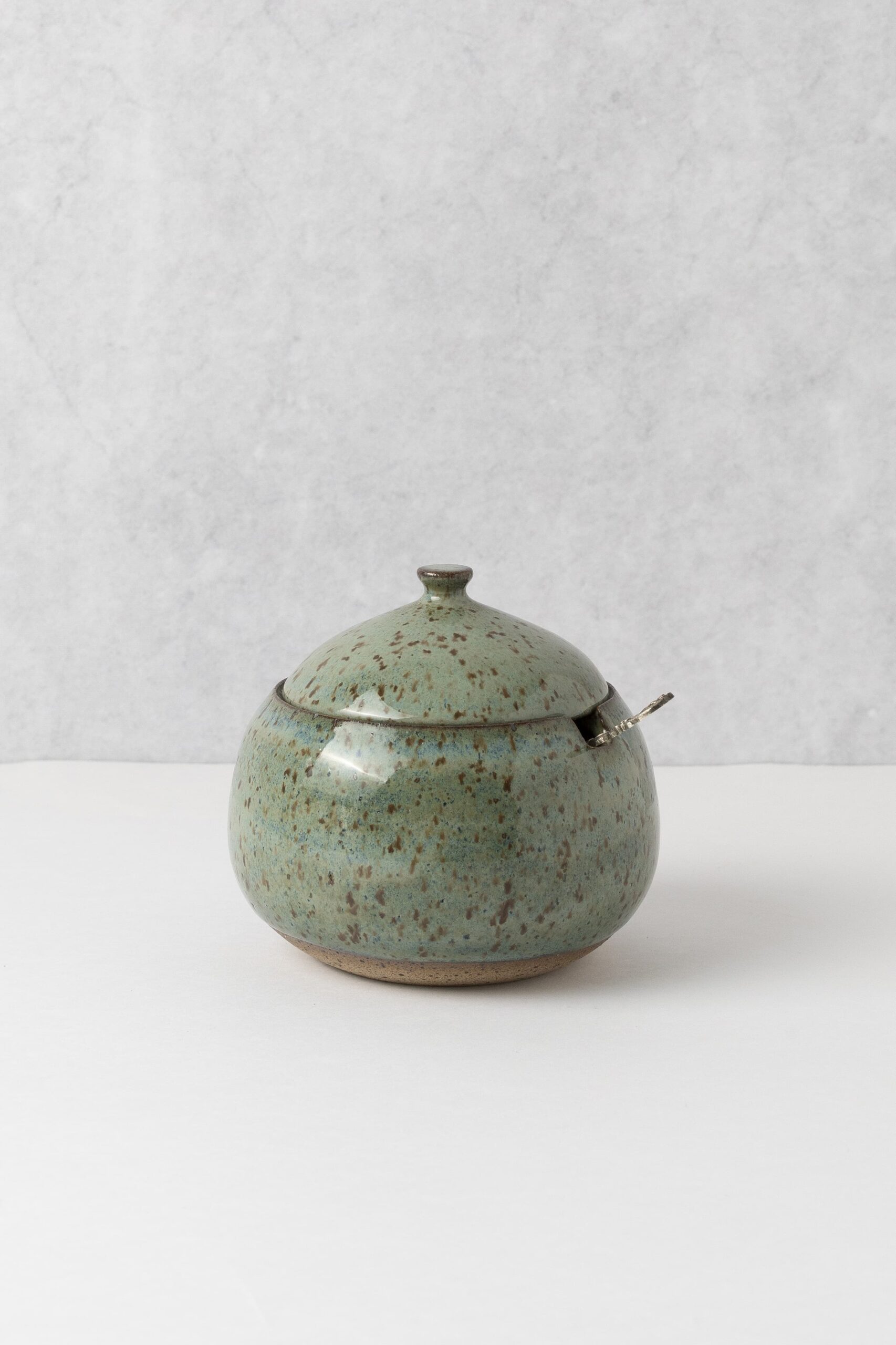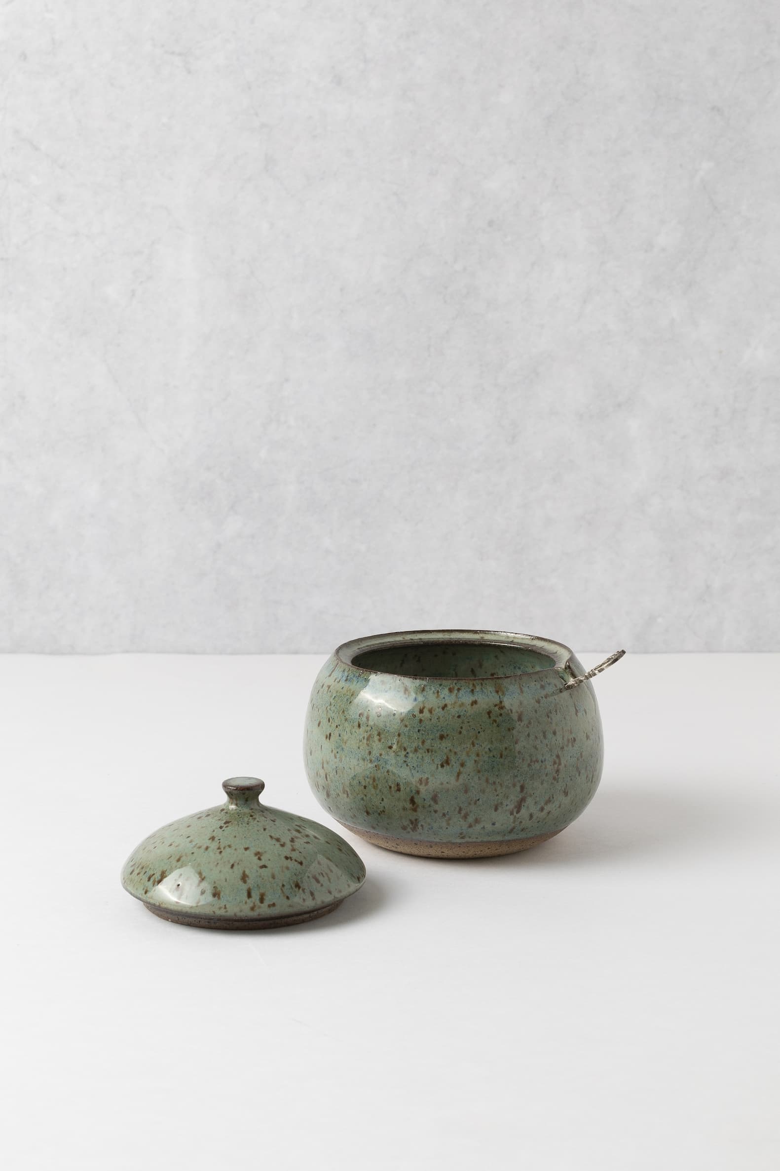 Açucareiro com tampa e abertura para encaixe de colher. Pode ser usado como açucareiro ou saleiro.