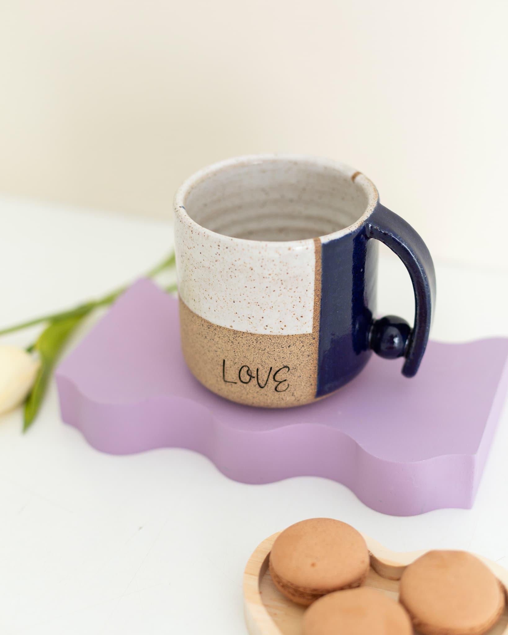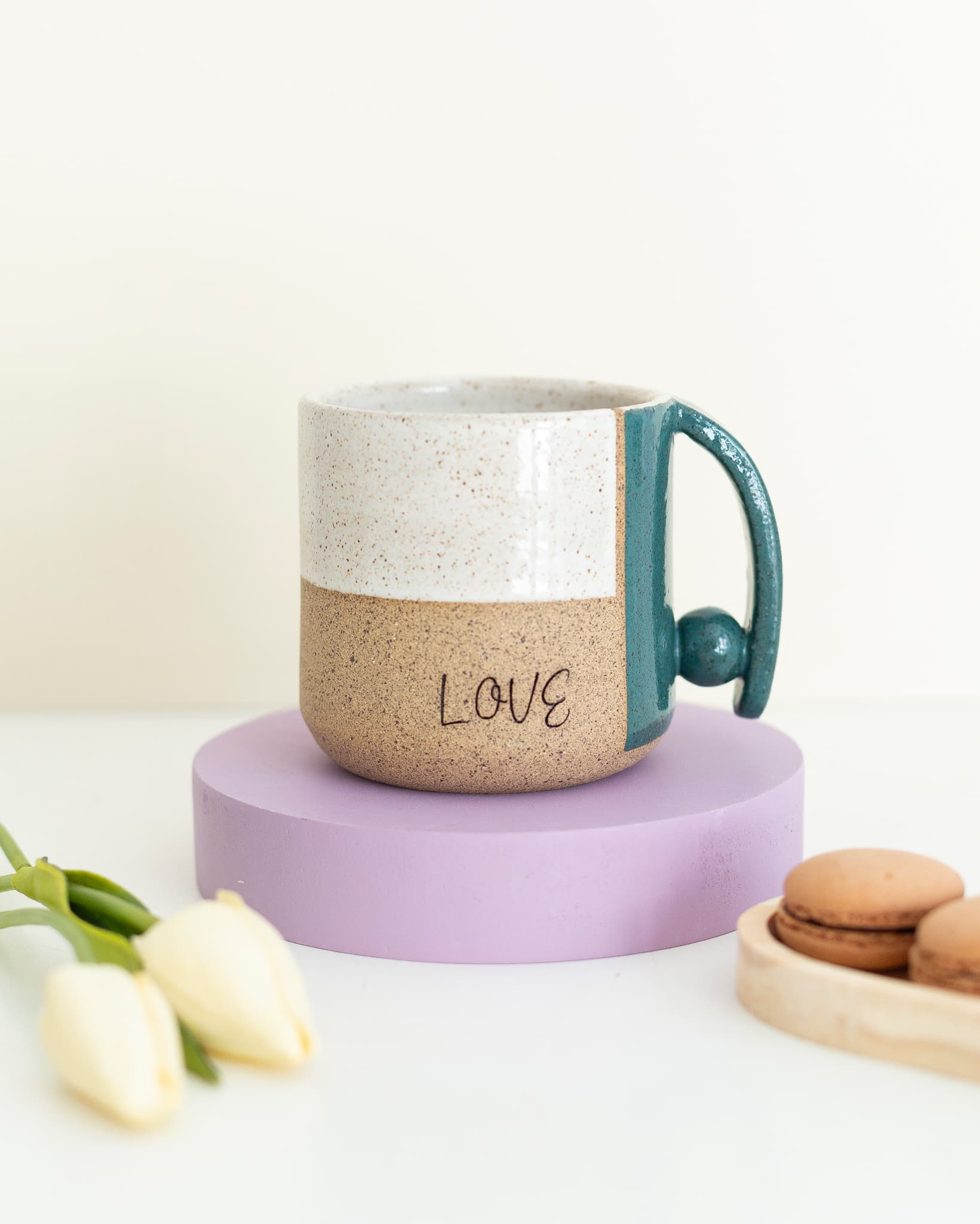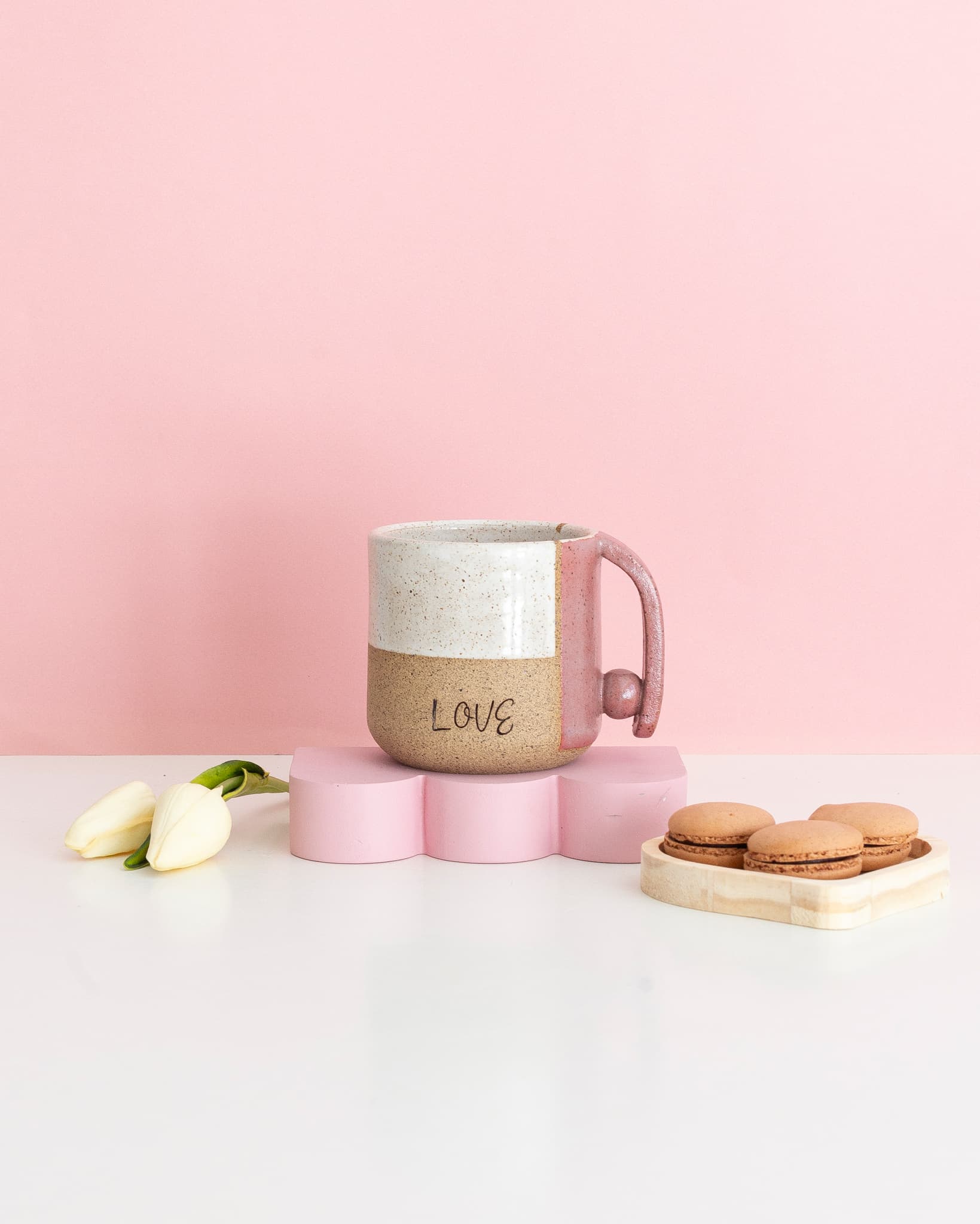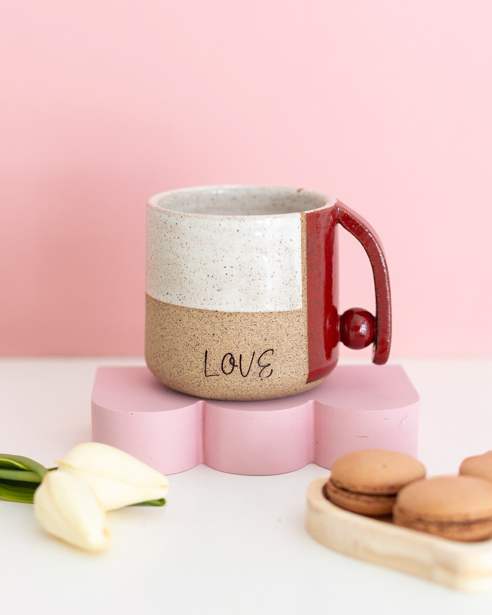 Caneca Love. Um modelo que traz um formato moderno e delicado de alça, e a palavra LOVE aplicada em baixo relevo. Num tamanho ideal para água, suco, café com leite, capuccino ou sua bebida favorita. Para servir bebidas quentes ou frias.