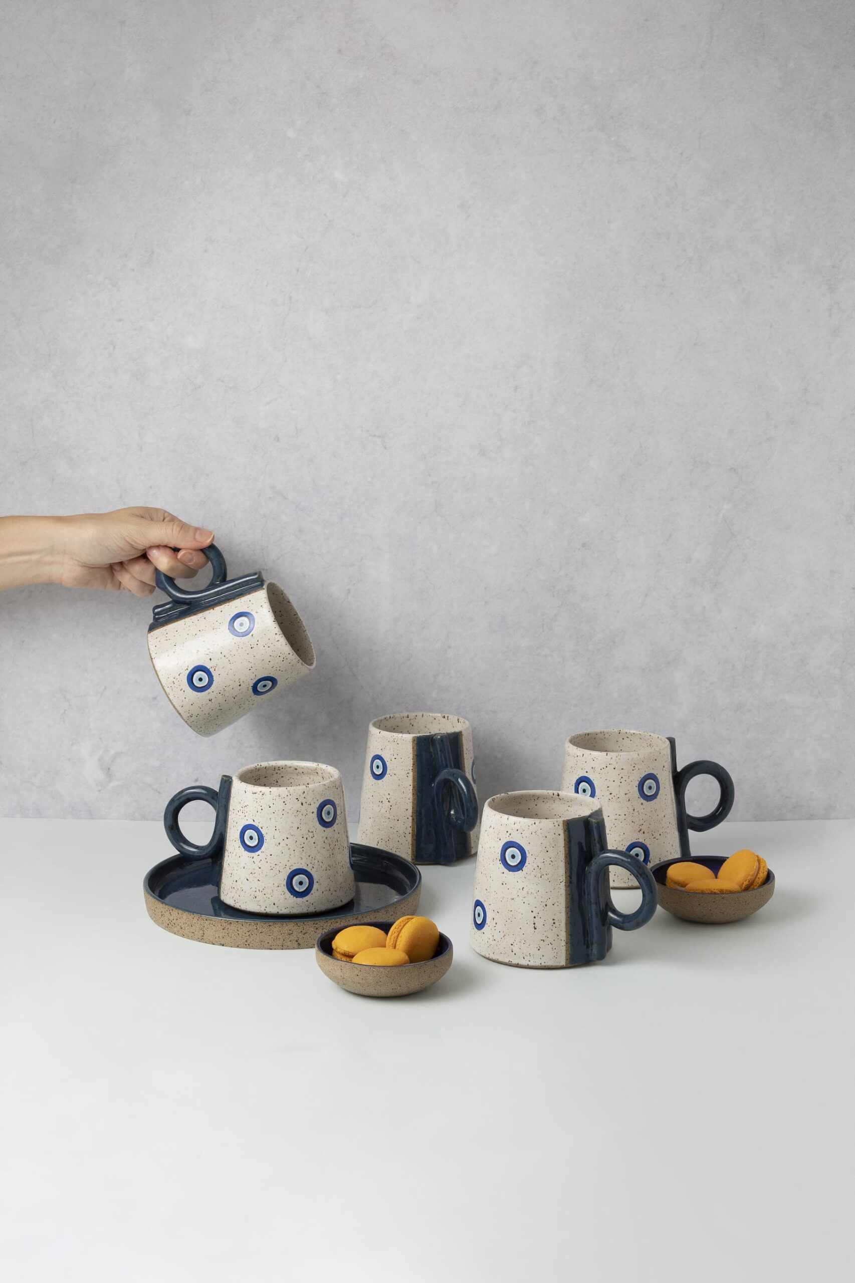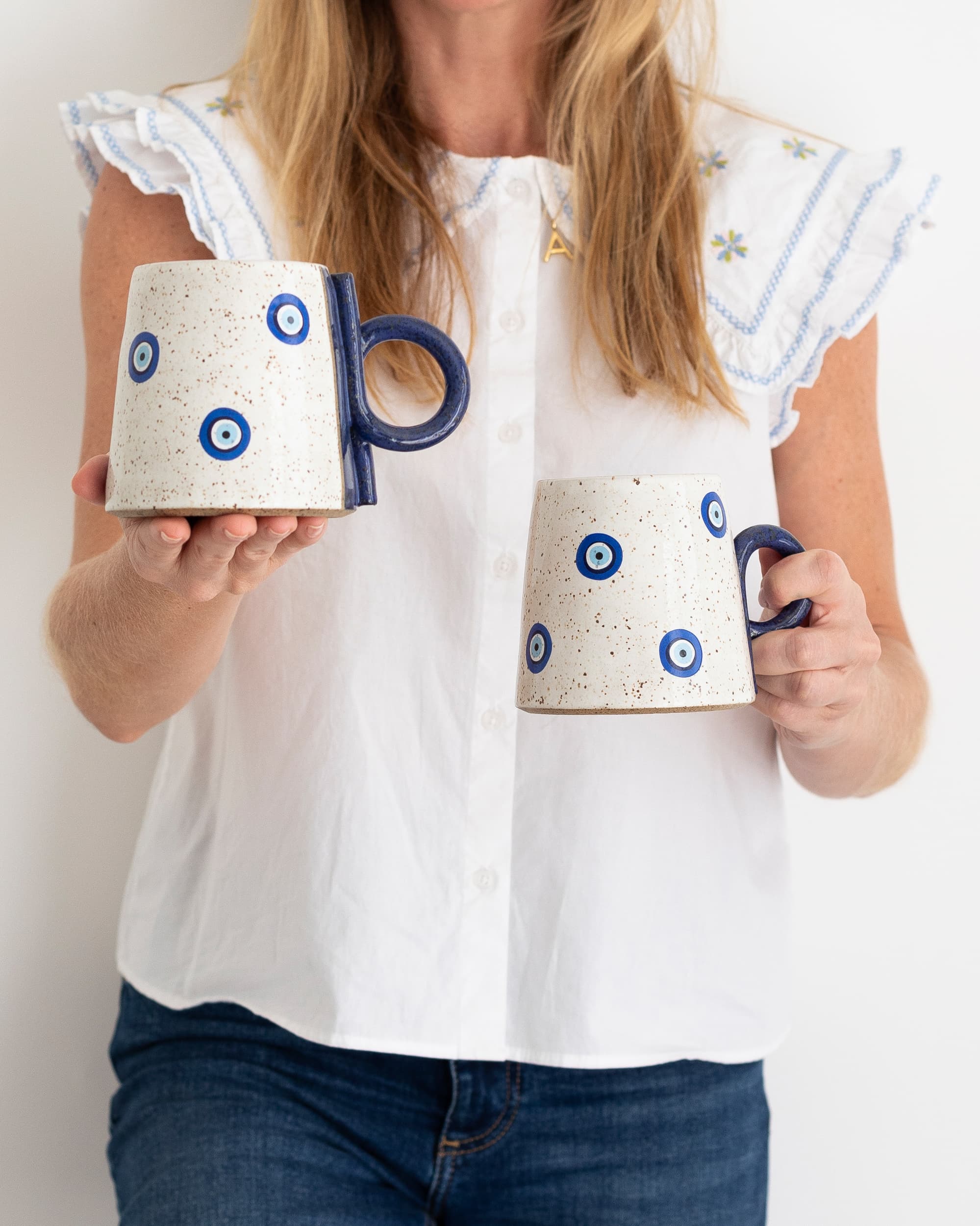 Caneca Nazar. Com aplicação de decalque em formato de olho grego: símbolo poderoso, que além de afastar energias ruins, suas cores permitem atrair coisas boas e proteção. Num tamanho ideal para água, suco, café com leite, capuccino ou sua bebida favorita. Para servir bebidas quentes ou frias.