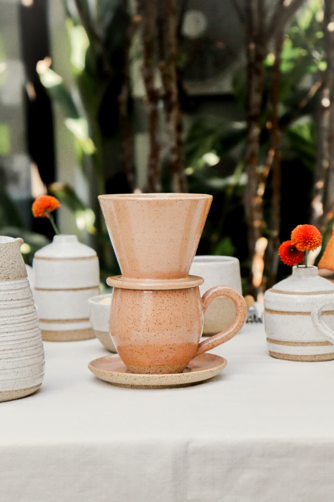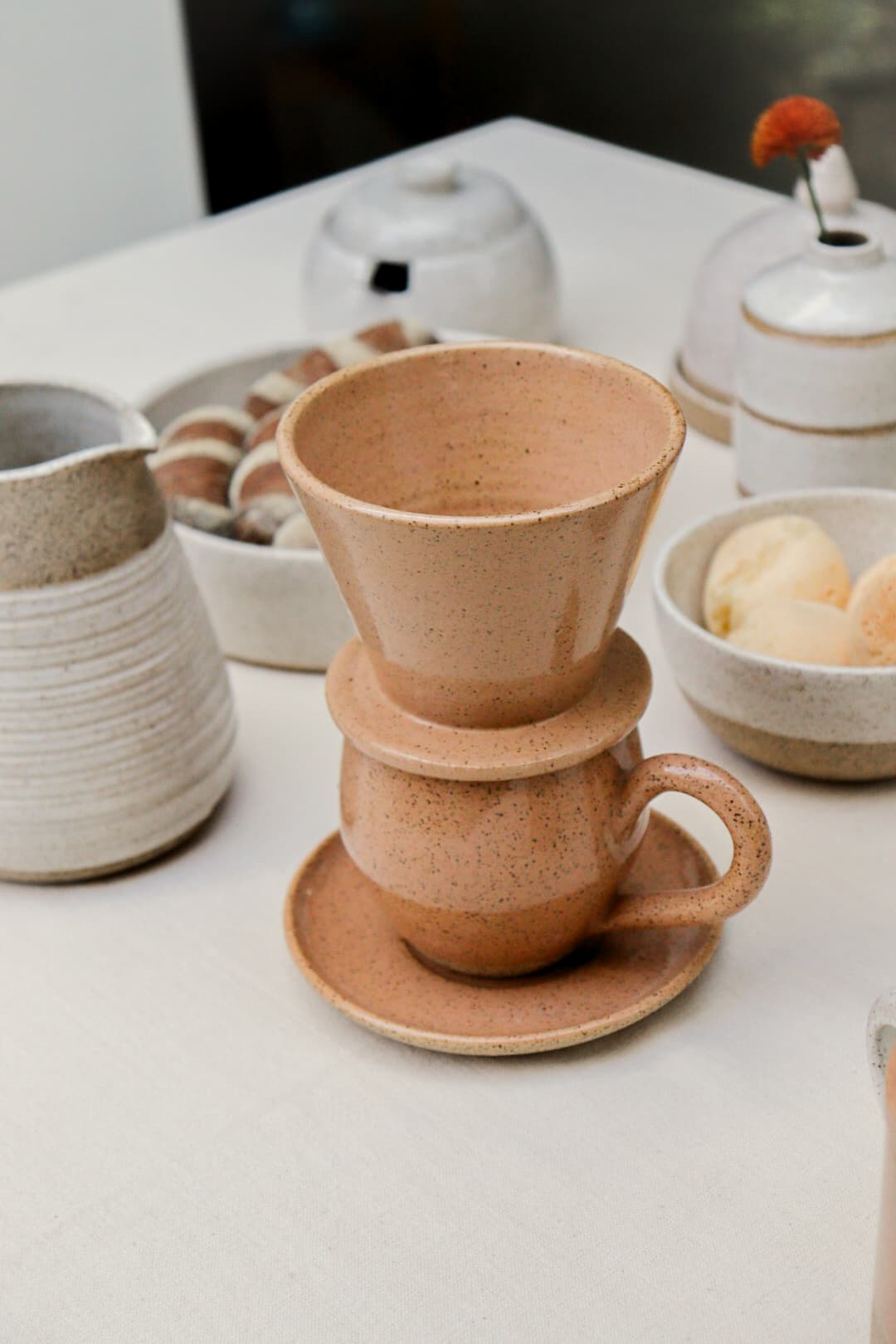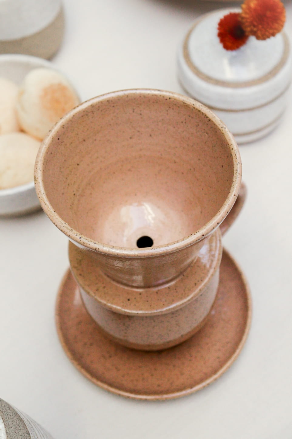 Coador em cerâmica pequeno para filtro de papel 102. Companheiro ideal para preparar aquele cafezinho fresco, onde quer que você esteja. Xícara Évora não acompanha o produto: imagem meramente ilustrativa.