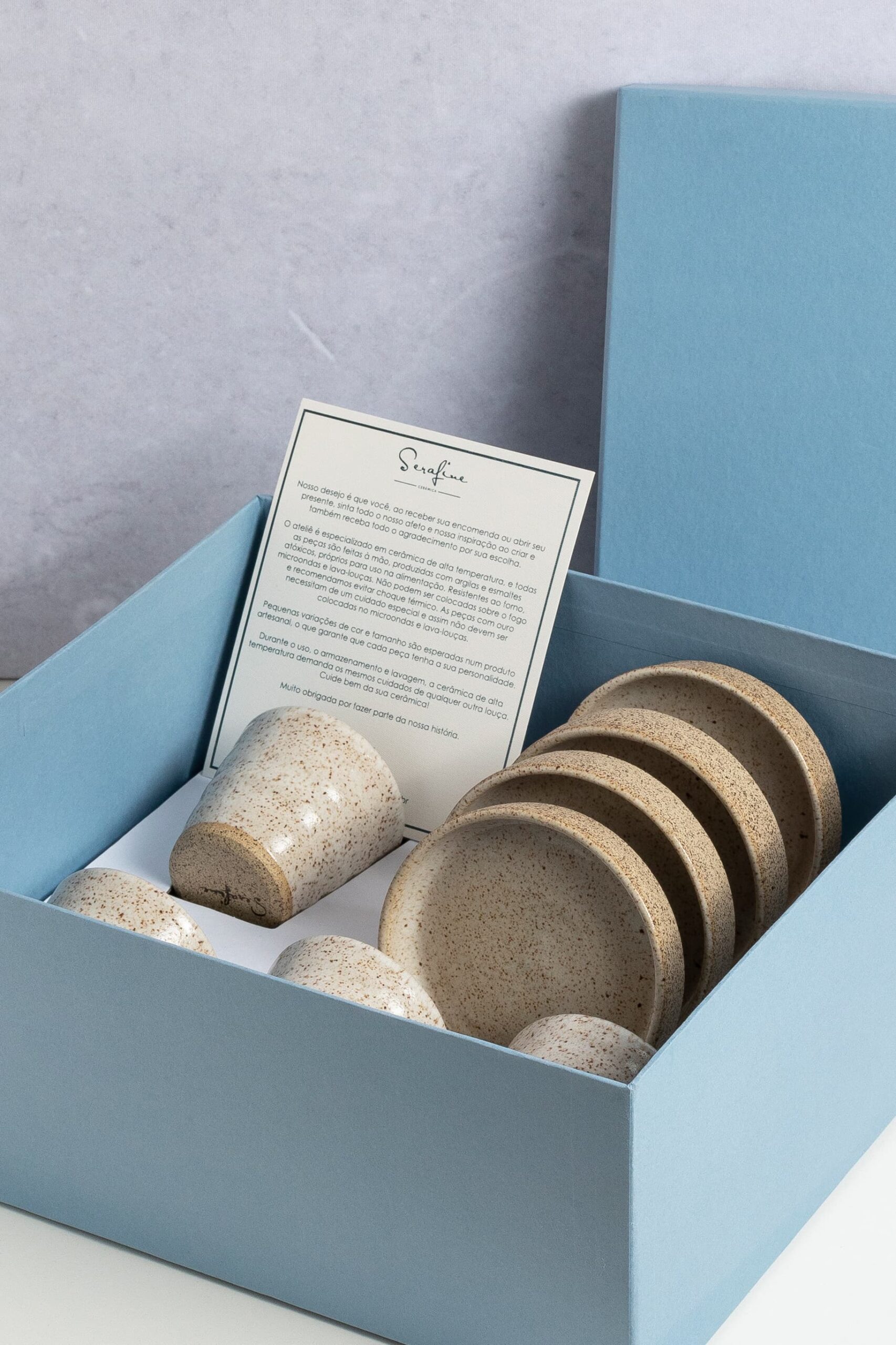 Jogo de 4 copos para café Loulé com detalhe ondulado e pires borda reta. Ideal para bebidas quentes ou frias. Nessa linha “Special Gift”, as peças acompanham a caixa de presente personalizada. Para registrar momentos especiais e datas comemorativas ao longo do ano.