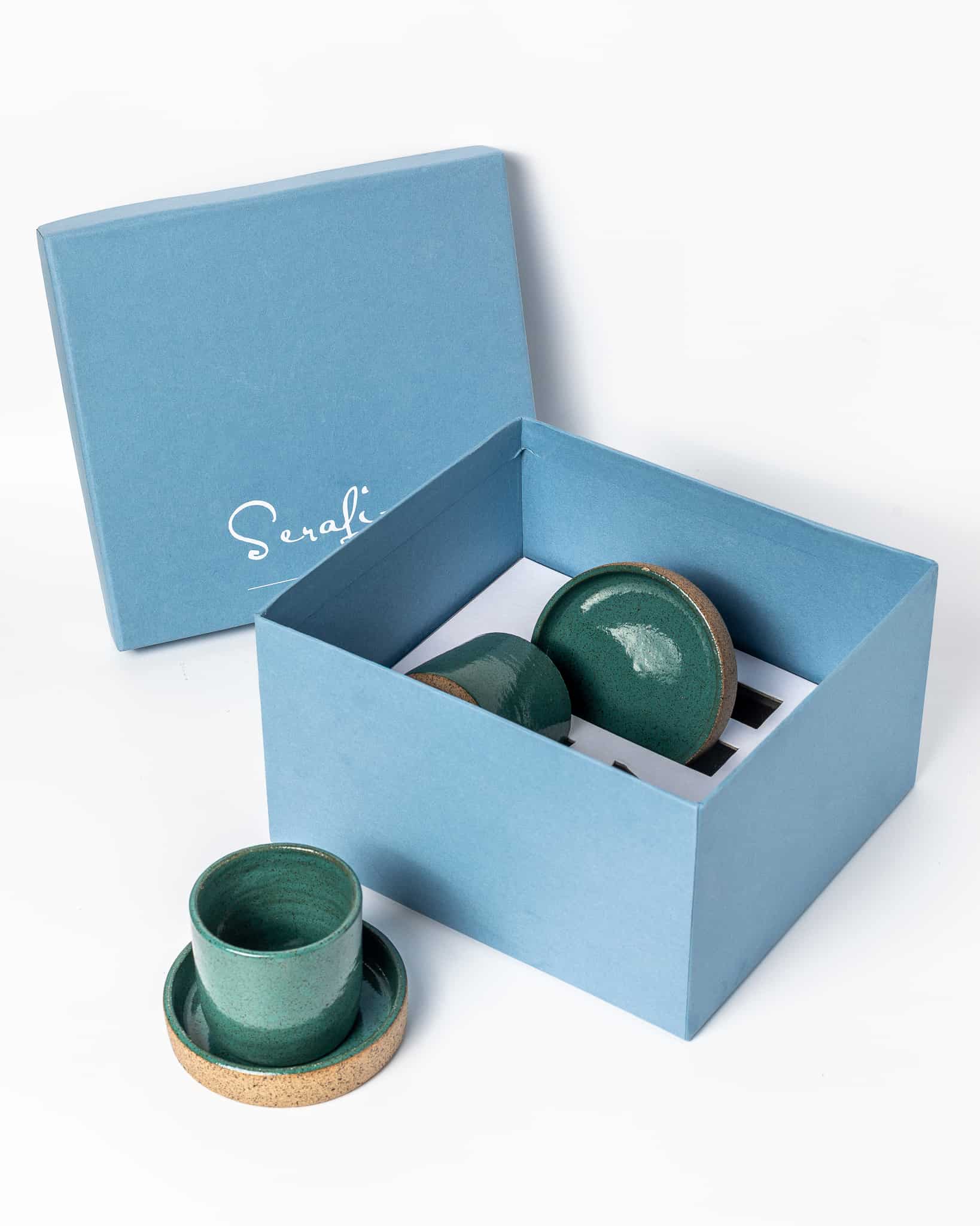 Jogo de 2 copos para café Porto pequeno com pires borda reta. Ideal para bebidas quentes ou frias. Nessa linha “Special Gift”, as peças acompanham a caixa de presente personalizada.