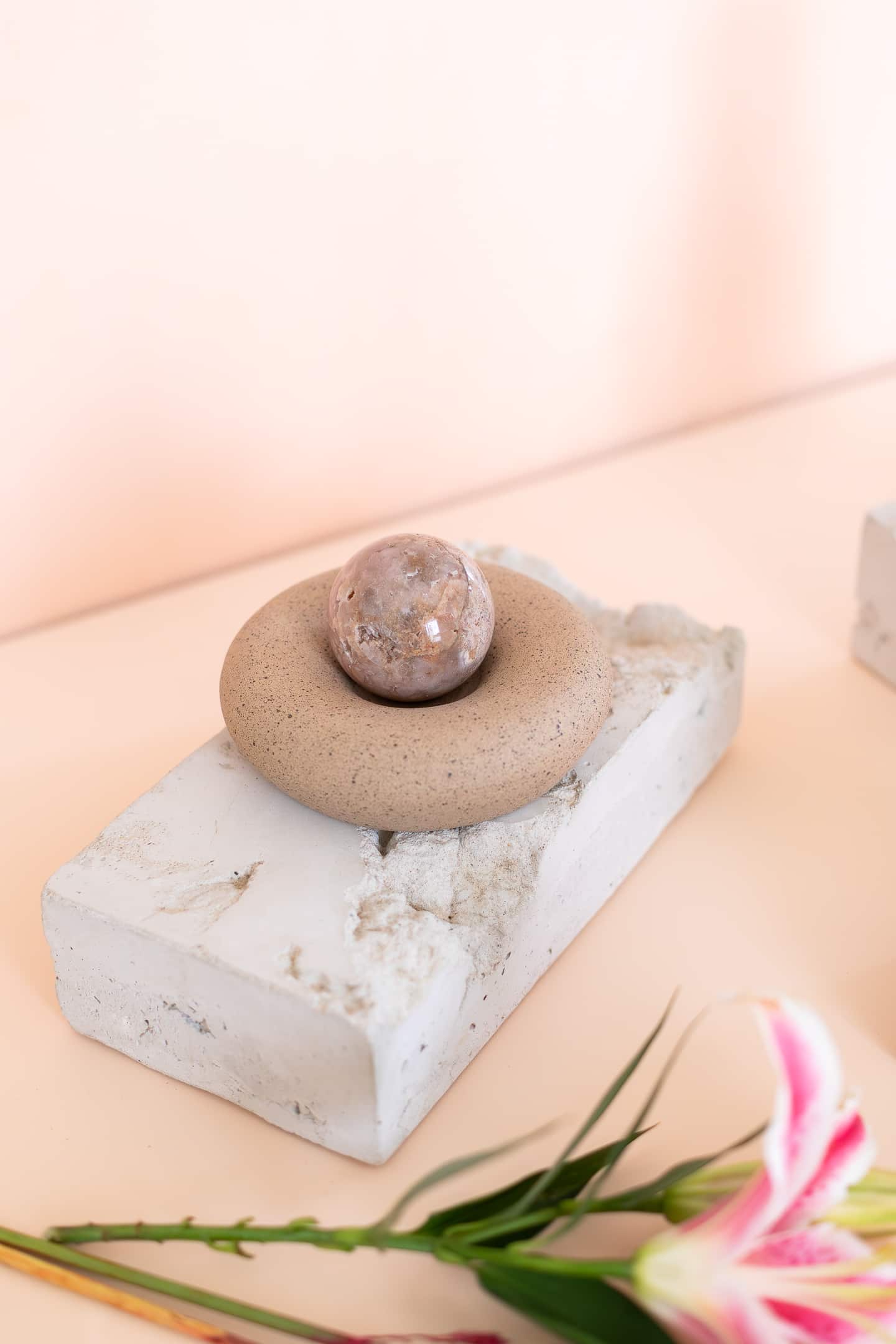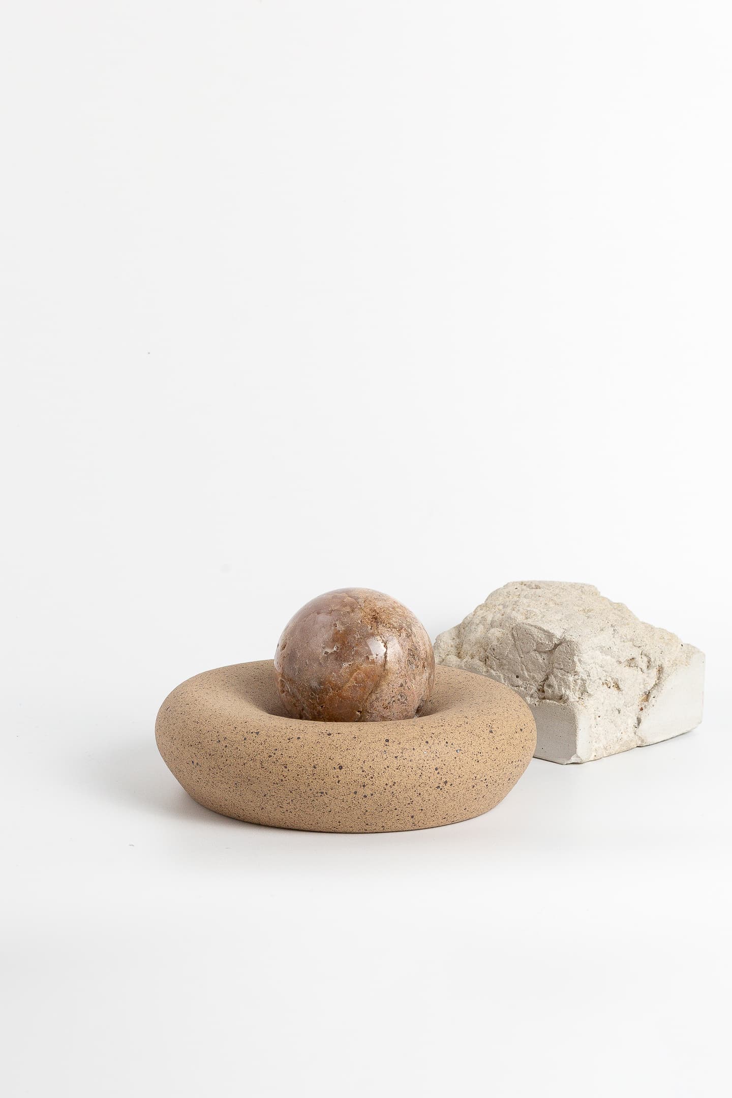 Dounts G: Inspirada na suavidade das formas orgânicas, a peça “Donuts” traz um equilíbrio perfeito entre matéria e design. A base em cerâmica abraça a pedra calcita rosa, que agrega um toque sofisticado e orgânico à peça. Um jogo de formas e materiais que traz harmonia e presença a qualquer espaço.