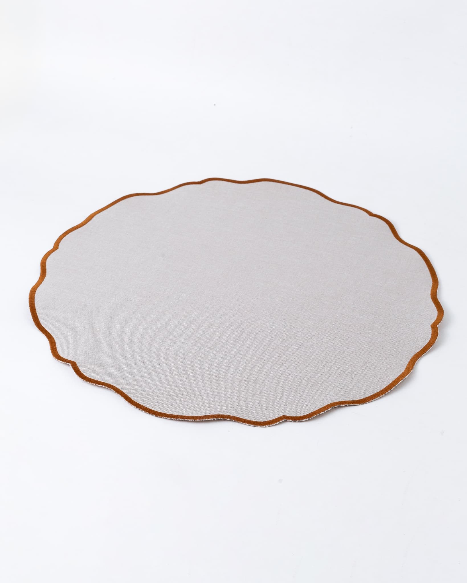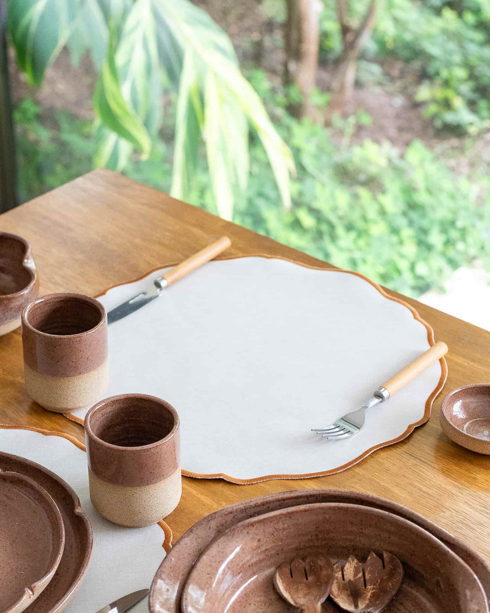 Jogo americano impermeável, de tecido sintético com textura de linho, no tom caqui e acabamento em toda sua volta na cor whisk, feito à mão. Ideal para incrementar sua mesa.