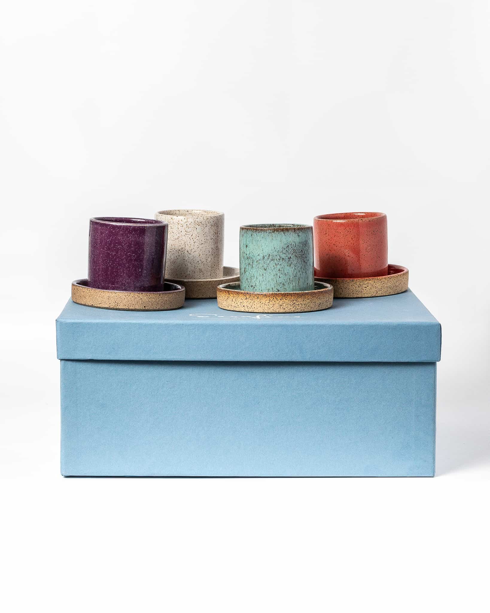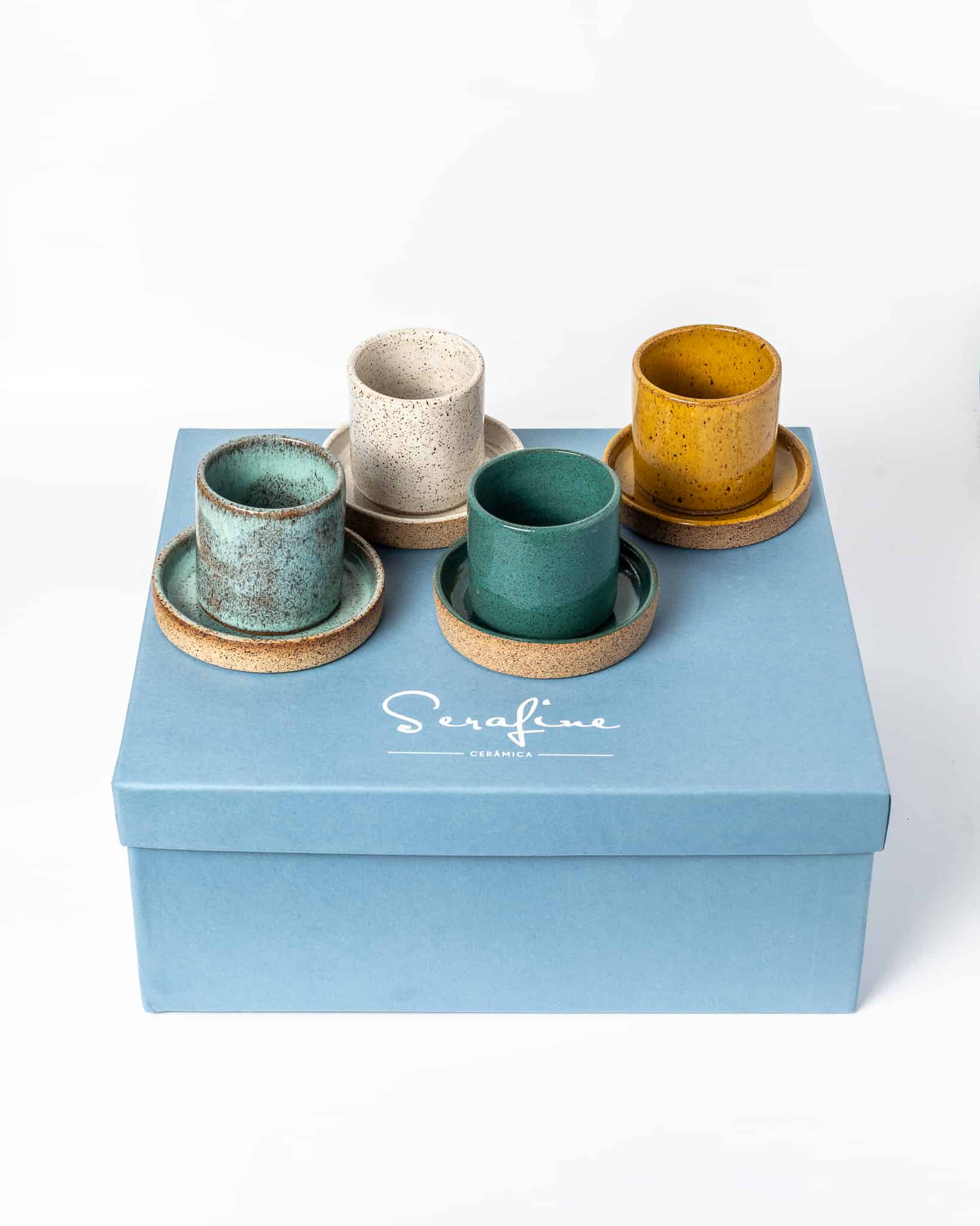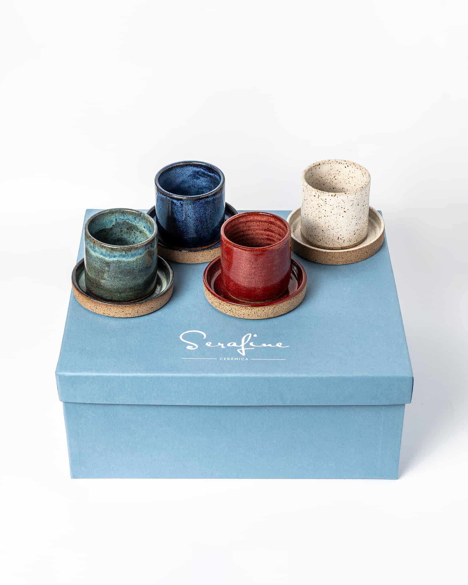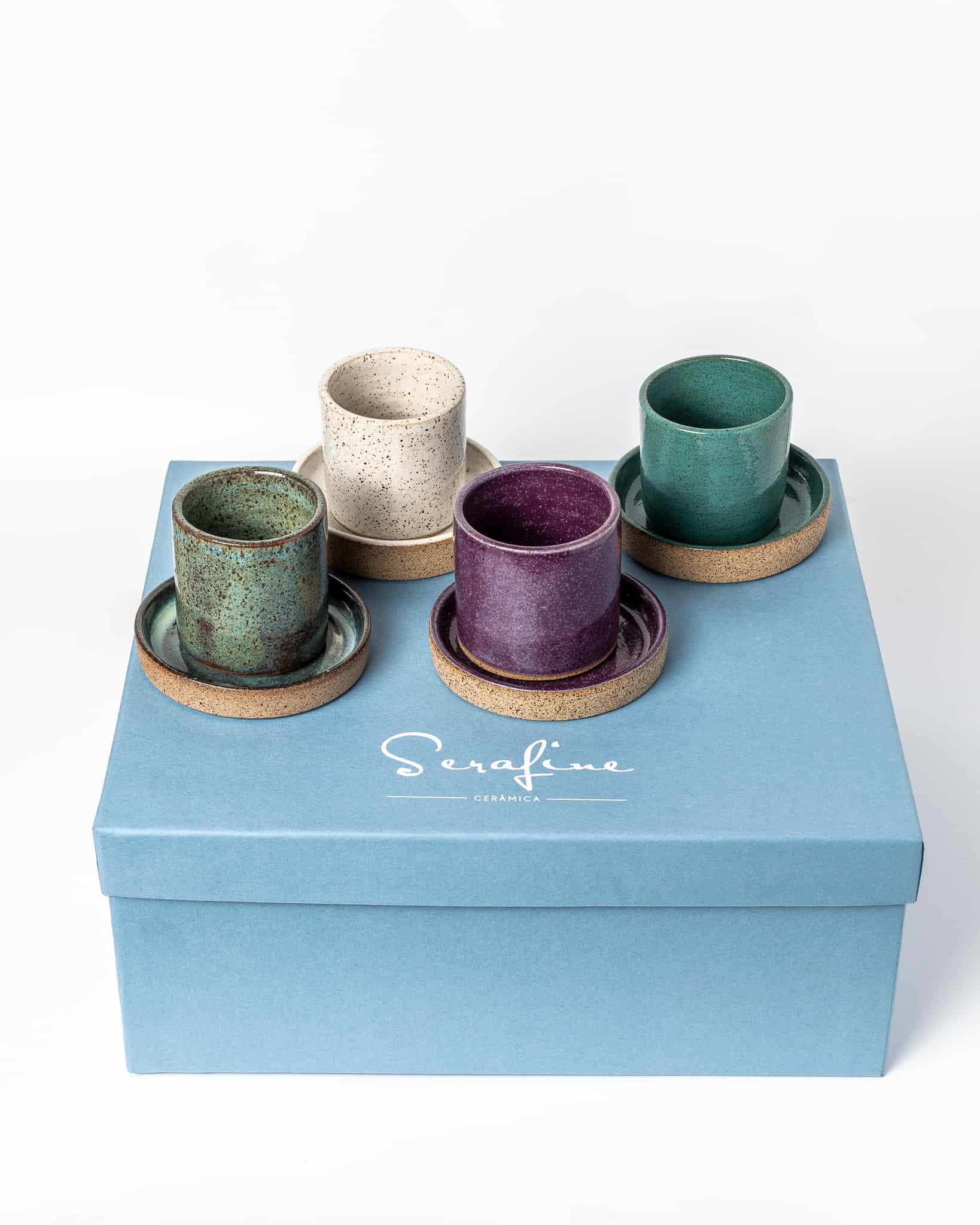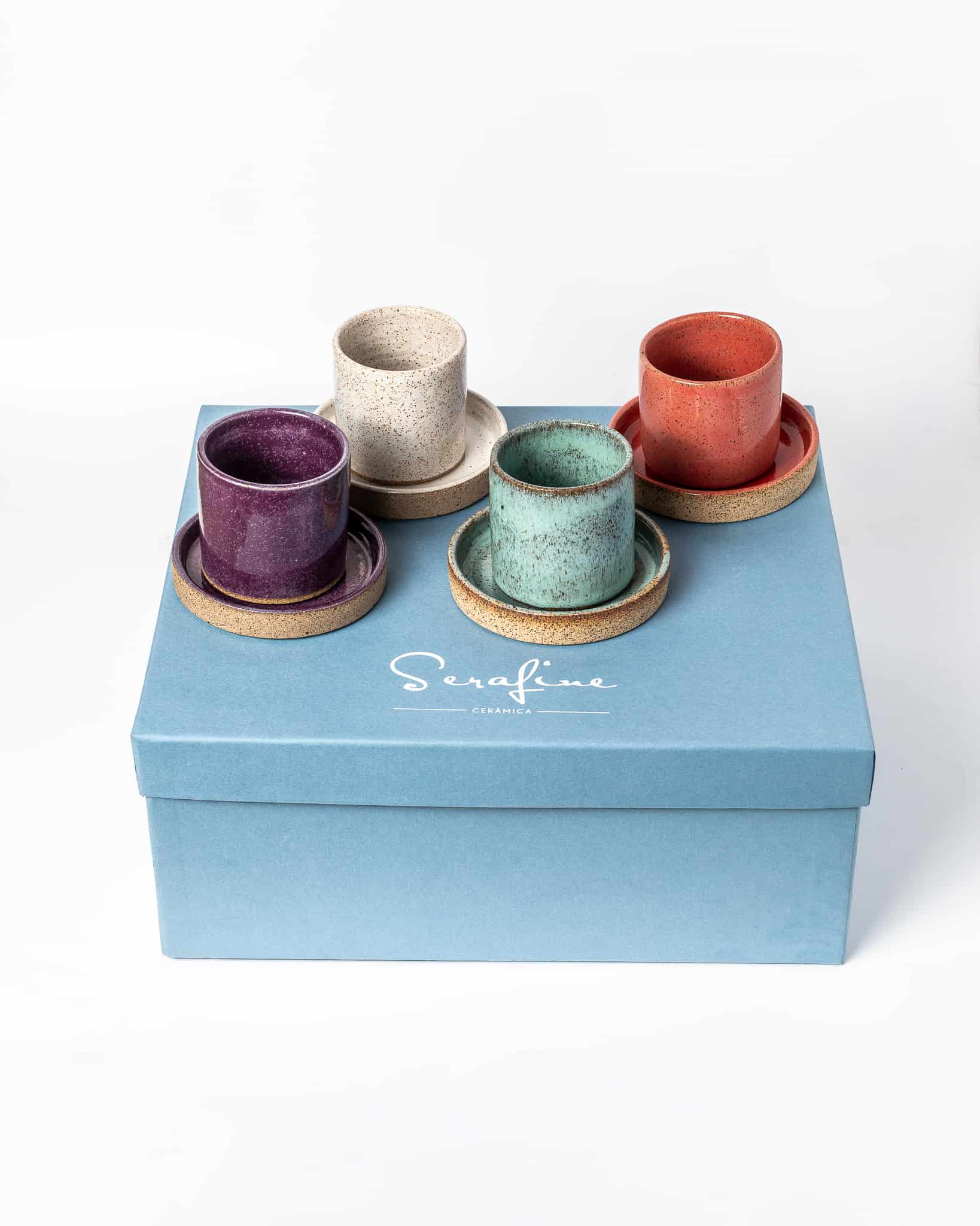 Composto por 4 copos de café Porto com pires borda reta bem alegres e coloridos e que são uma graça de presente para um cantinho de café. As peças acompanham a caixa de presente.