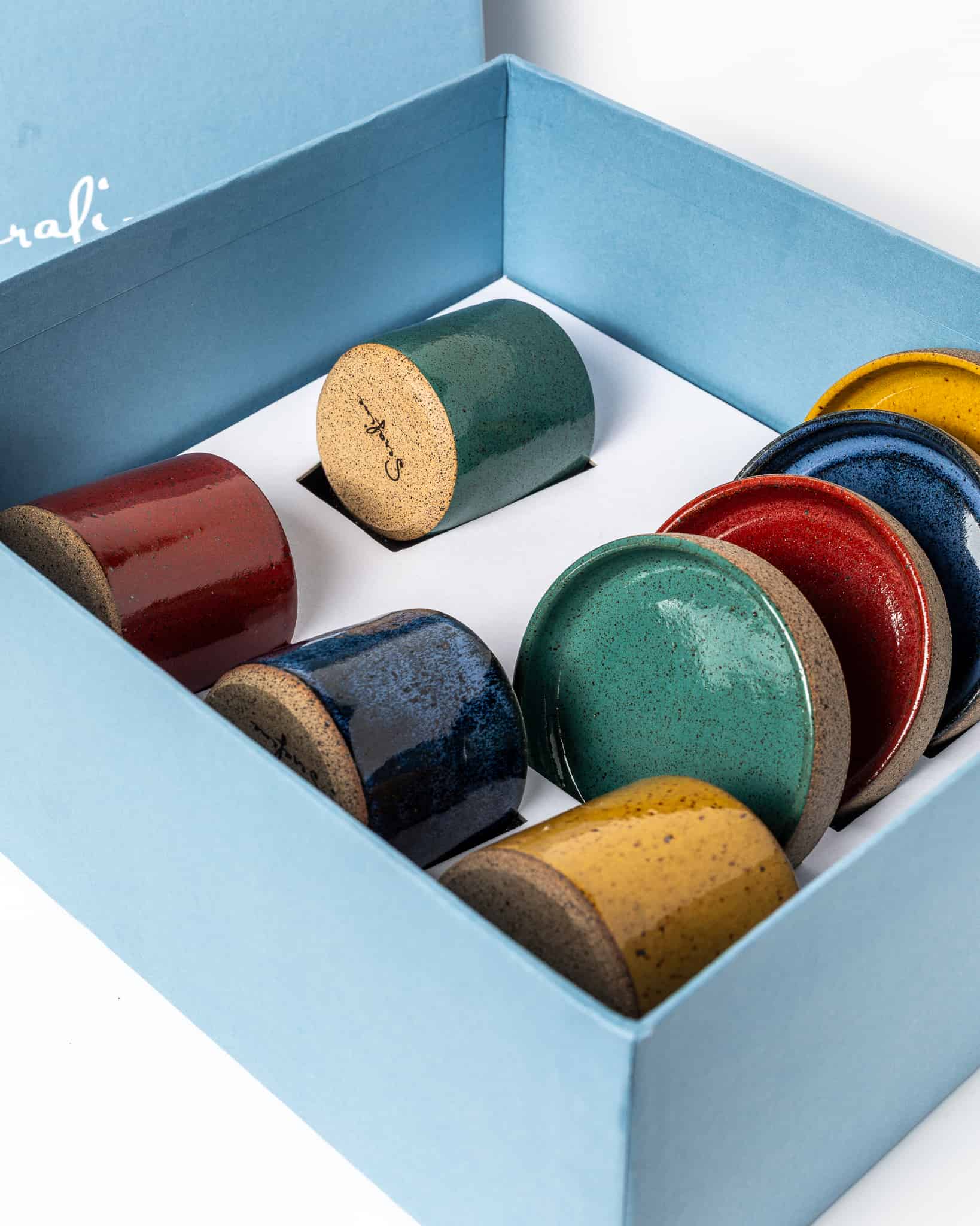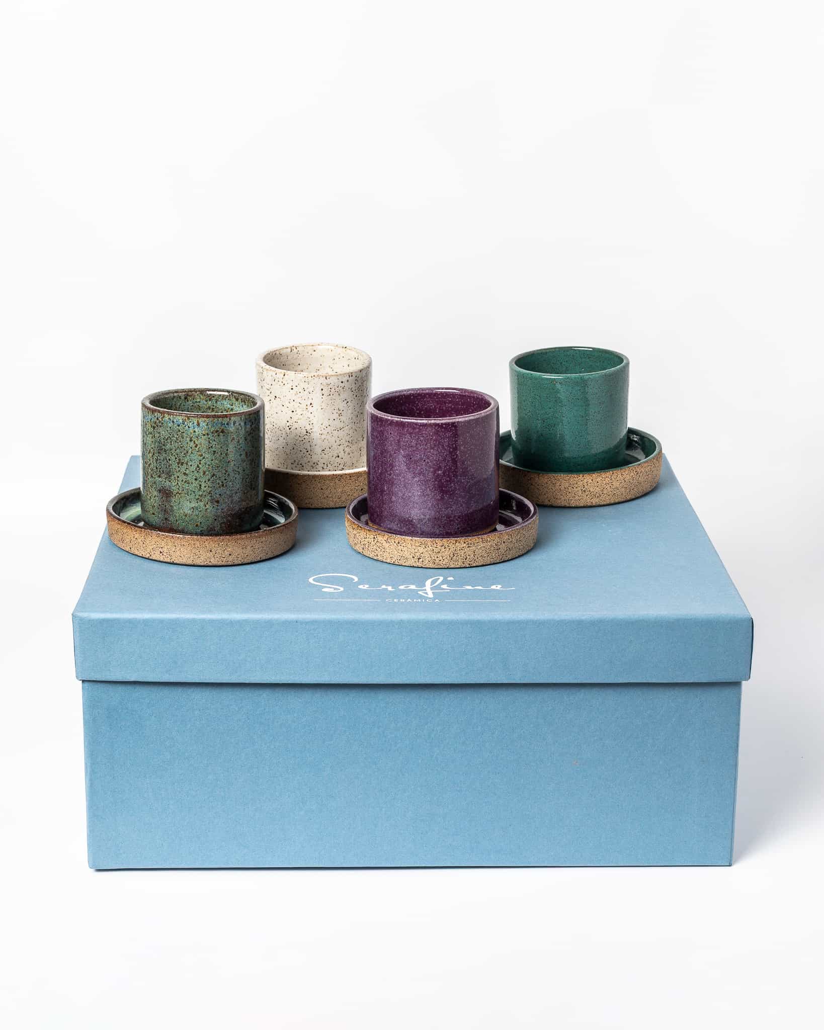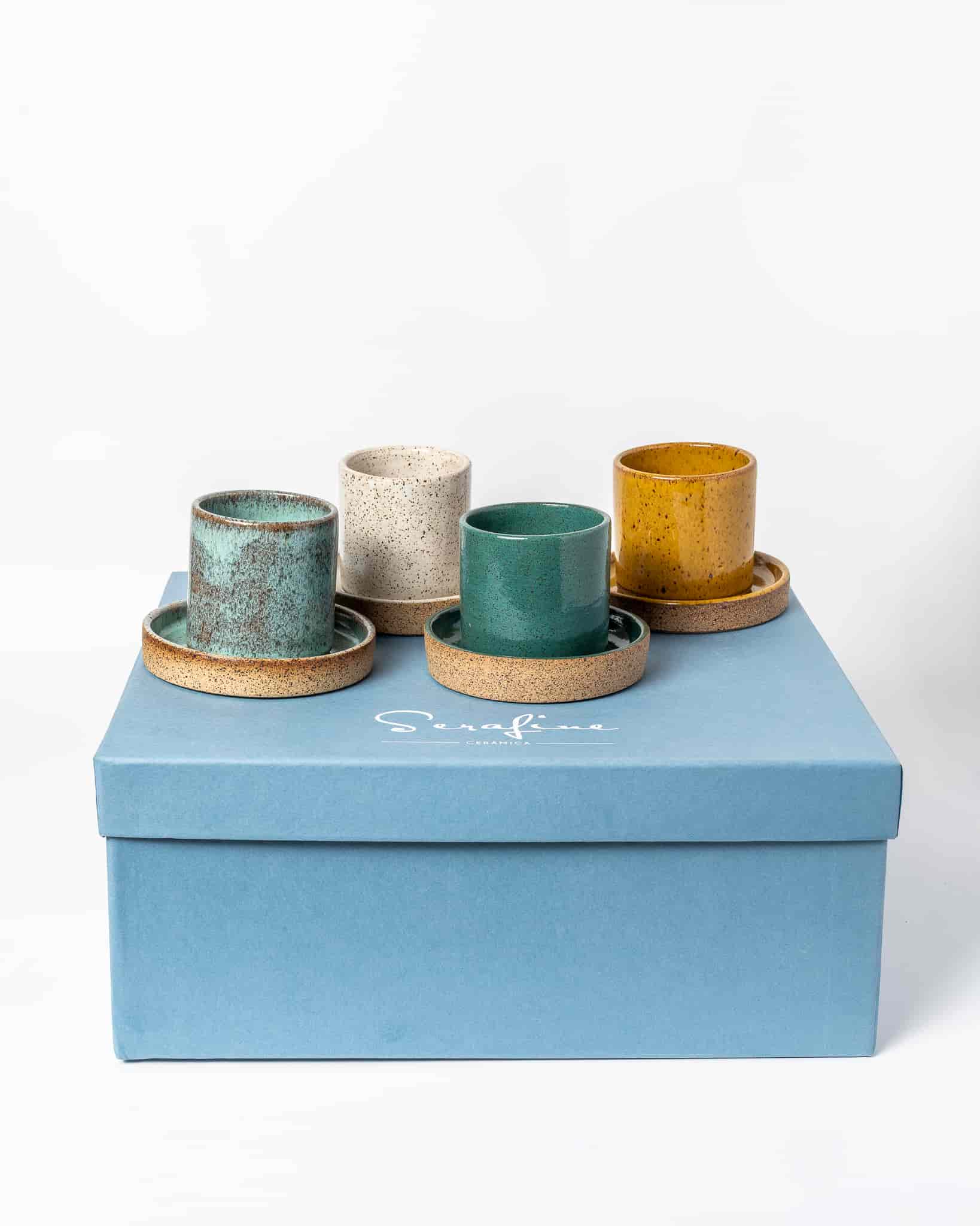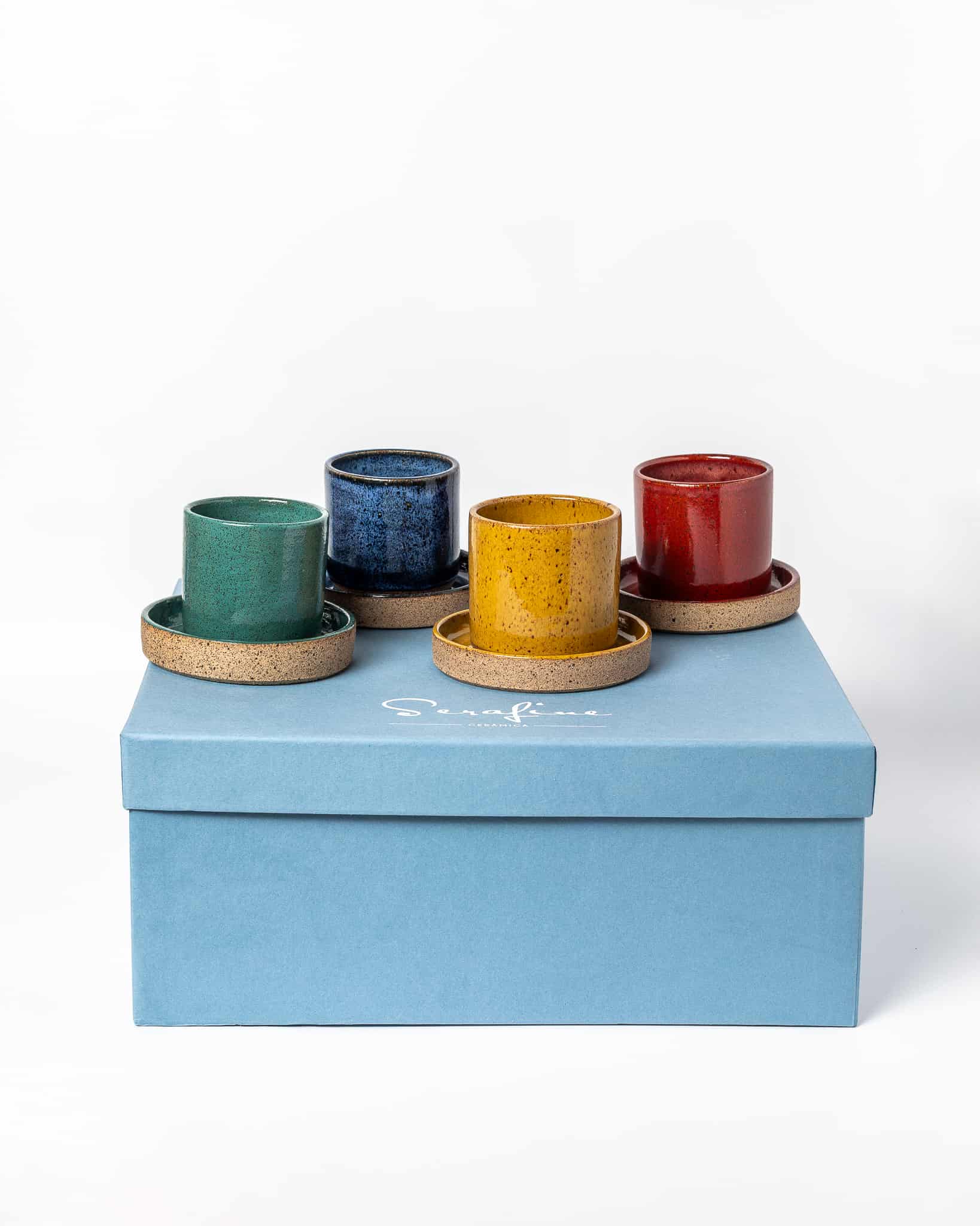 Composto por 4 copos de café Porto com pires borda reta bem alegres e coloridos e que são uma graça de presente para um cantinho de café. As peças acompanham a caixa de presente.