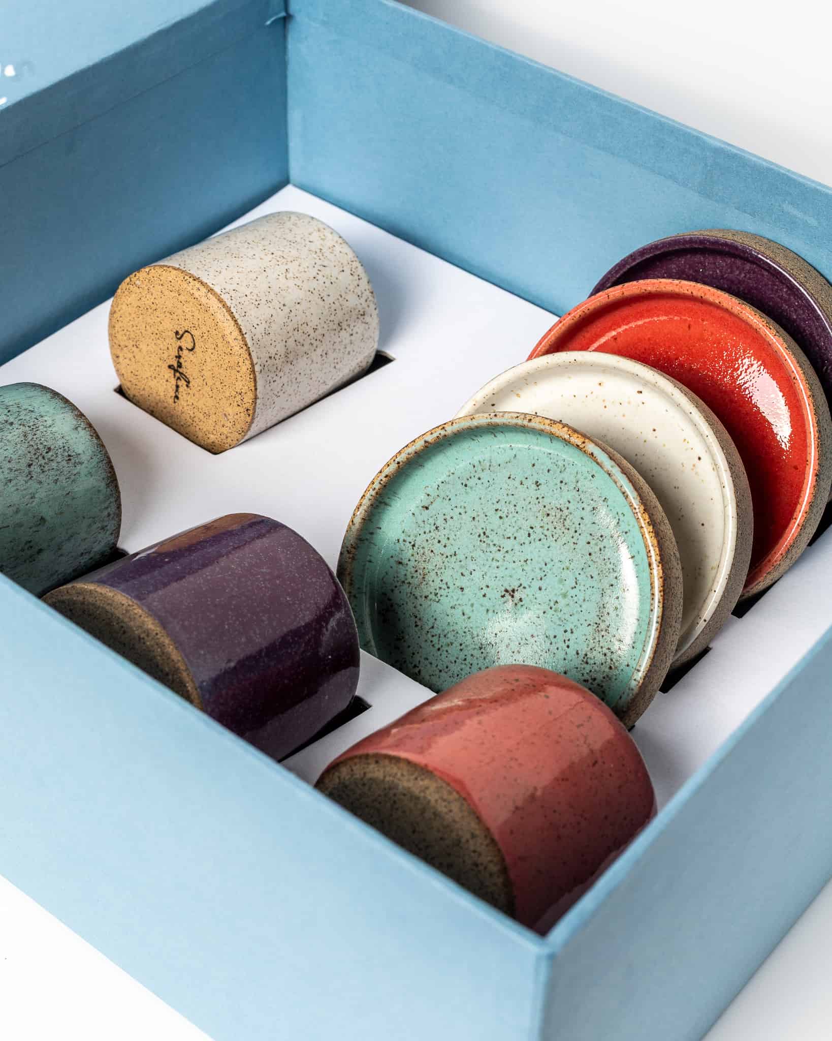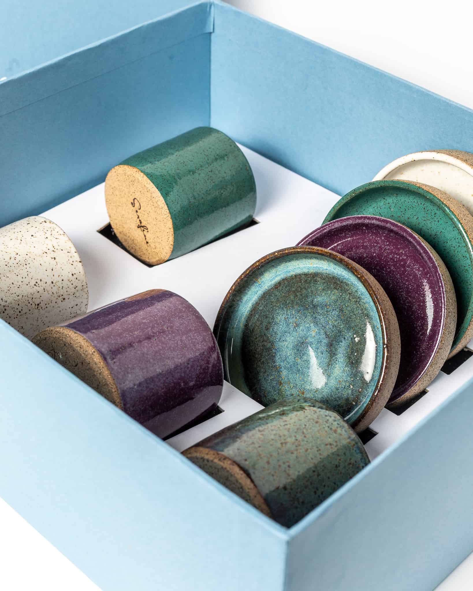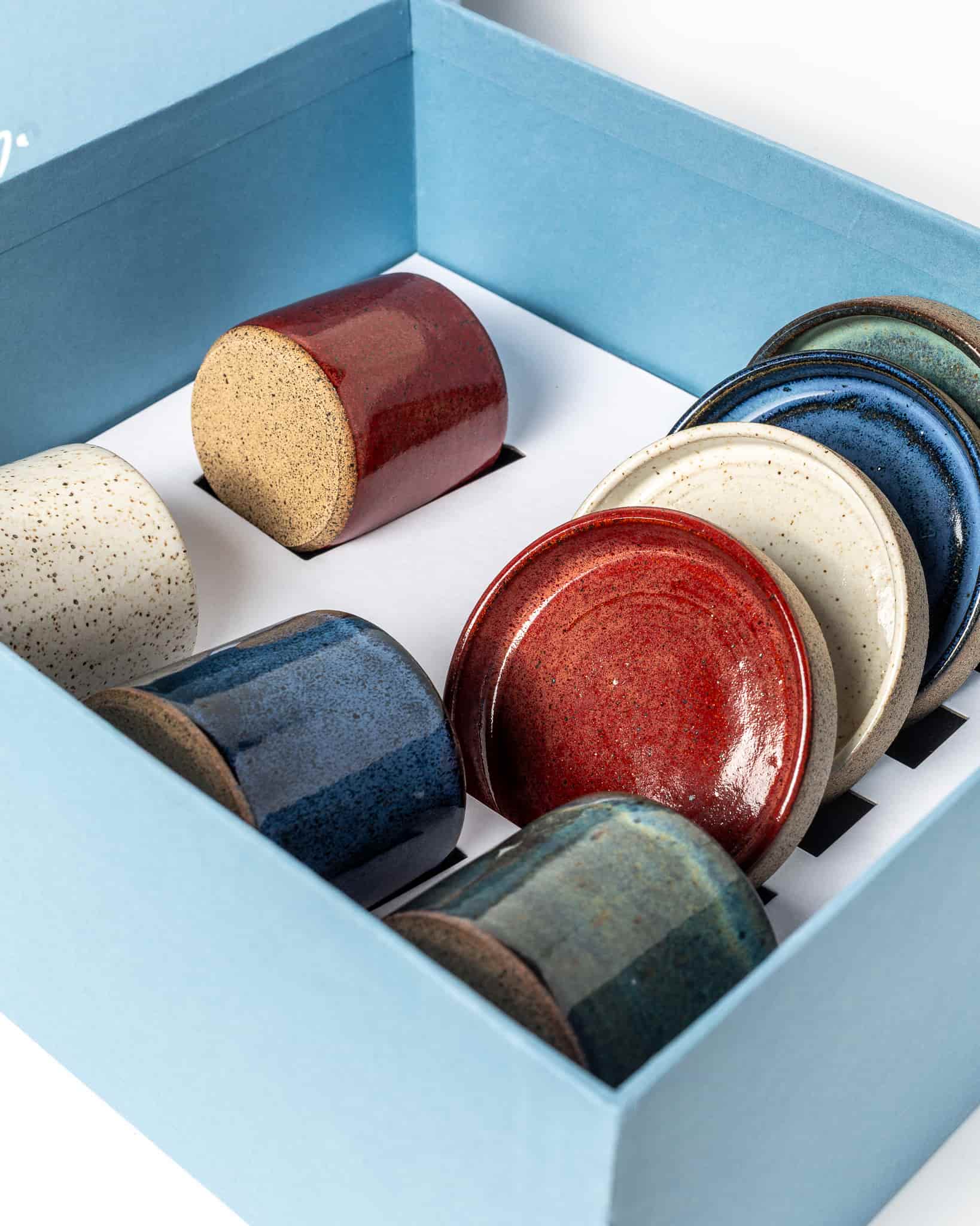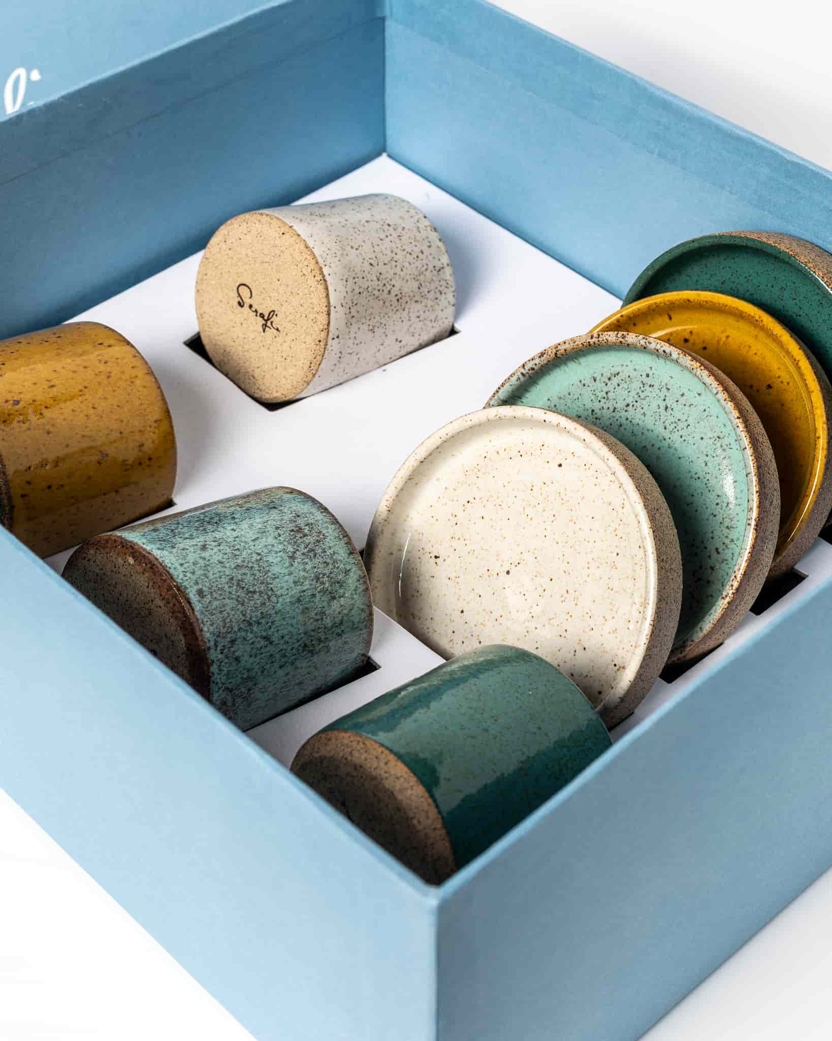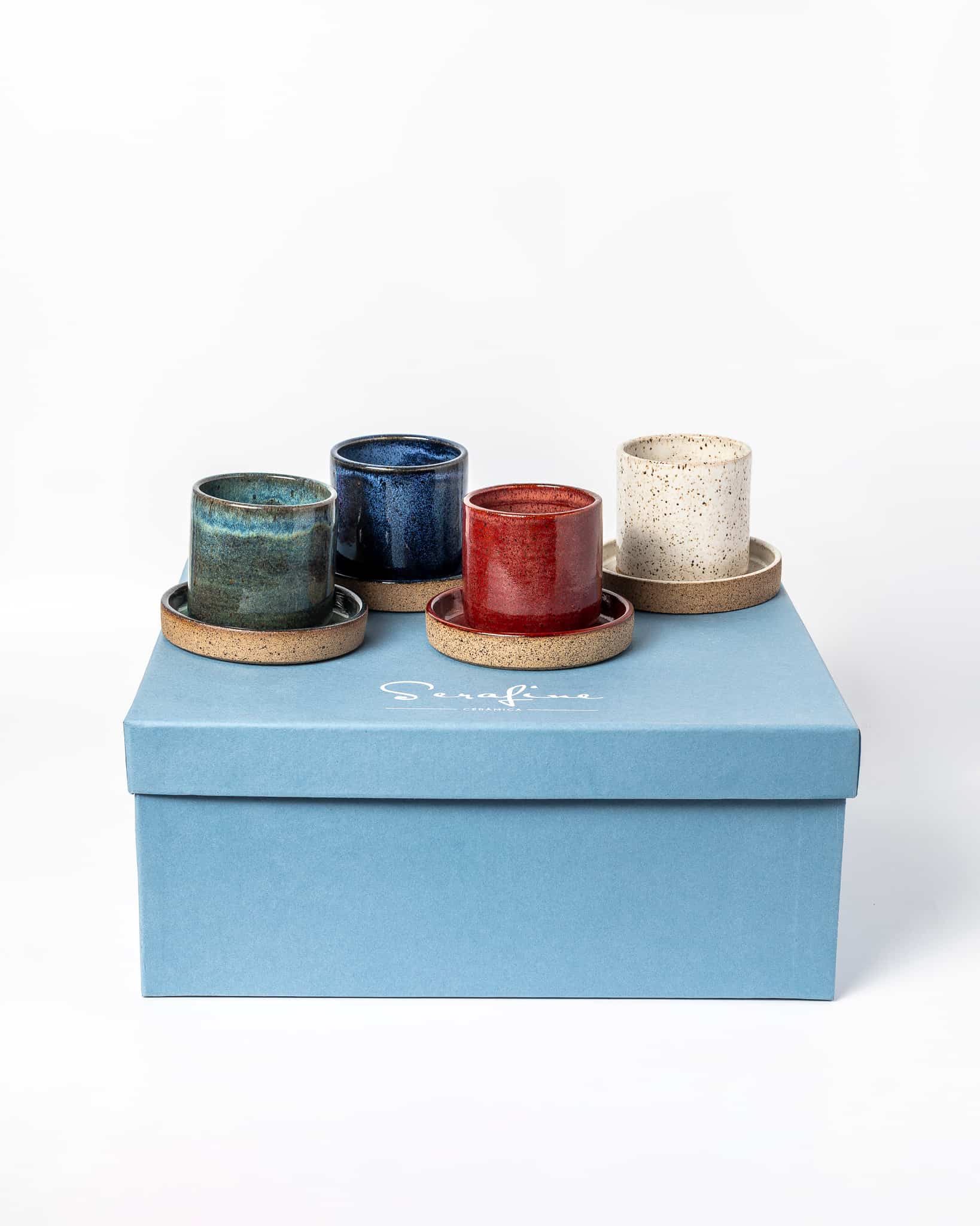 Composto por 4 copos de café Porto com pires borda reta bem alegres e coloridos e que são uma graça de presente para um cantinho de café. As peças acompanham a caixa de presente.