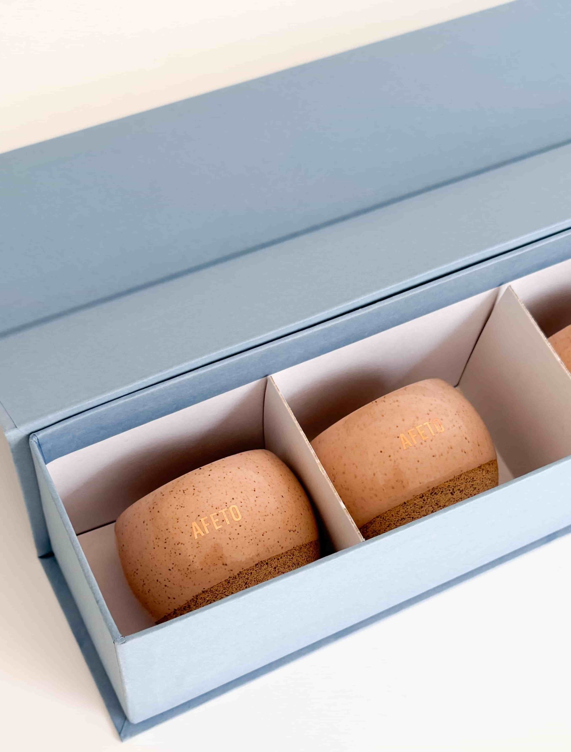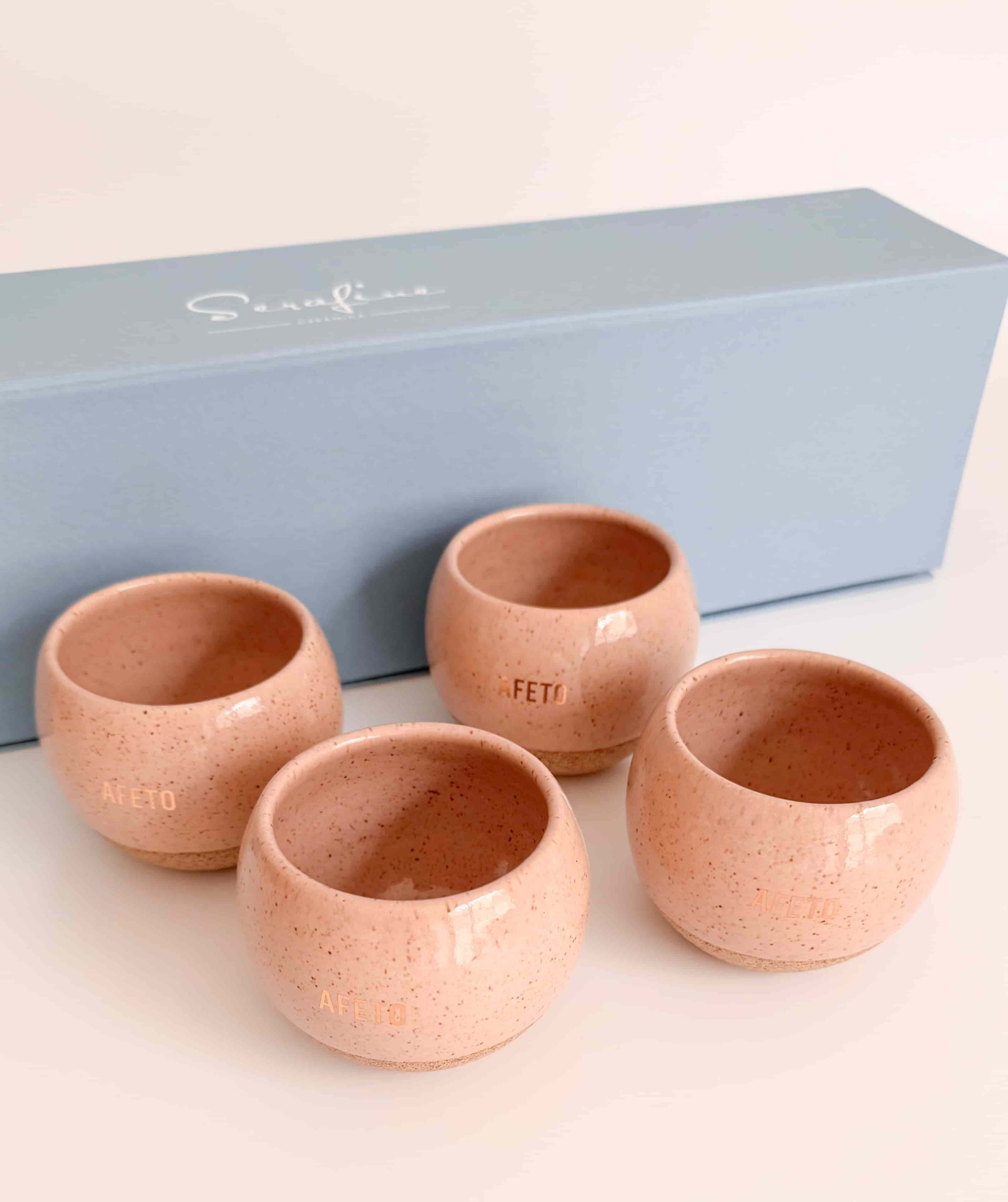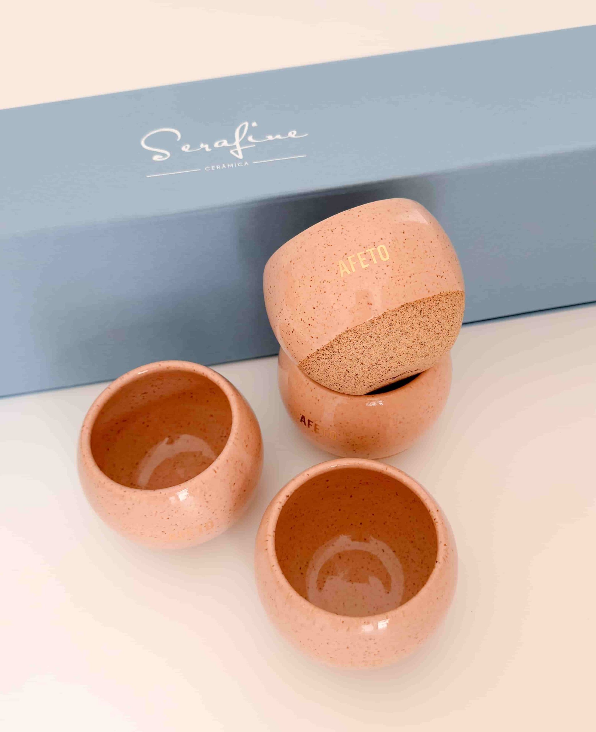 Kit com 4 copos para café Faro com a palavra AFETO em ouro. Acompanha a caixa cartonada. Ideal para bebidas quentes ou frias.