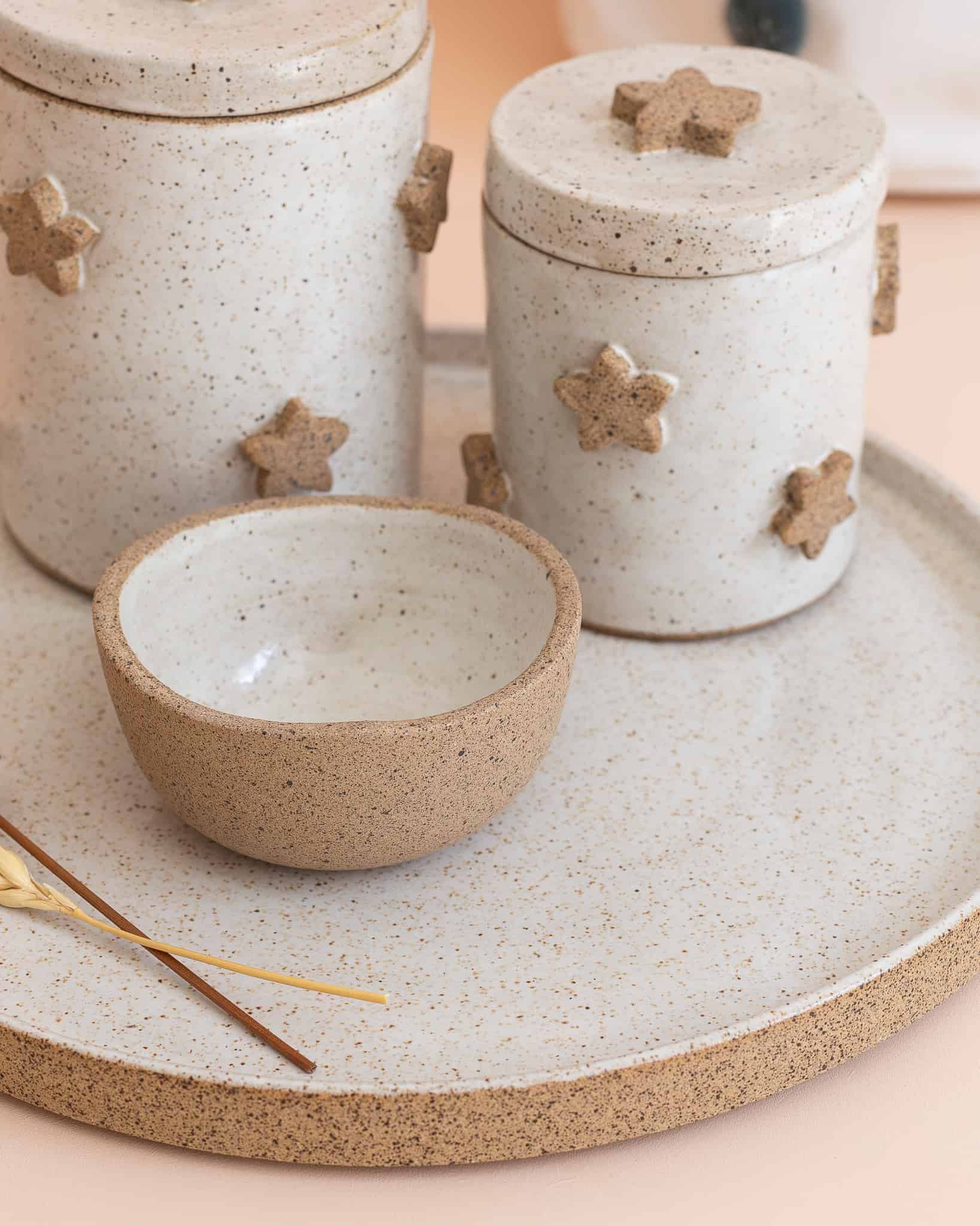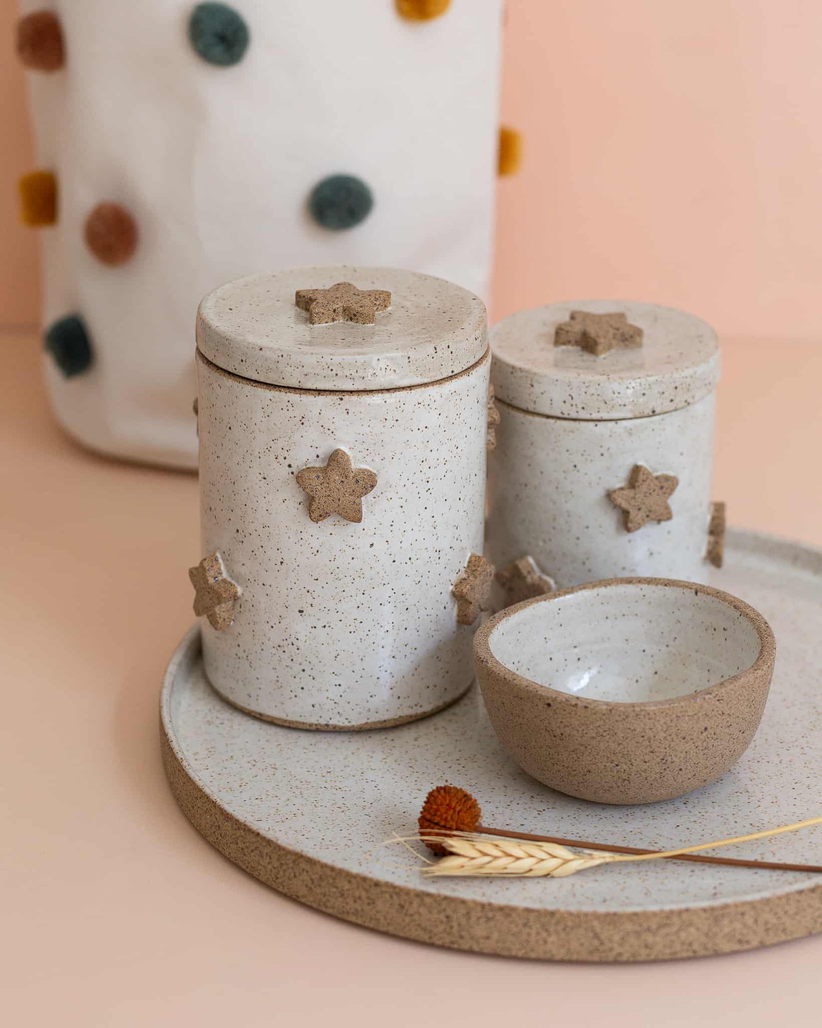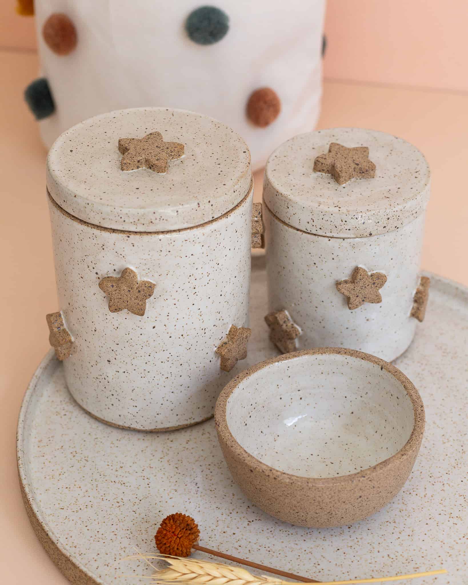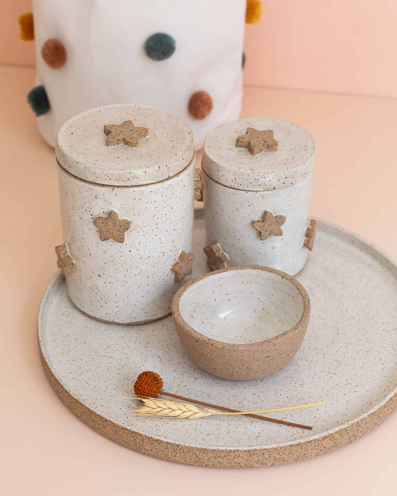 kit higiene. Feito à mão, cada peça carrega o encanto do acabamento rústico e a suavidade dos tons naturais. O toque especial fica por conta das pequenas estrelas em relevo, que adicionam charme e personalidade ao conjunto.