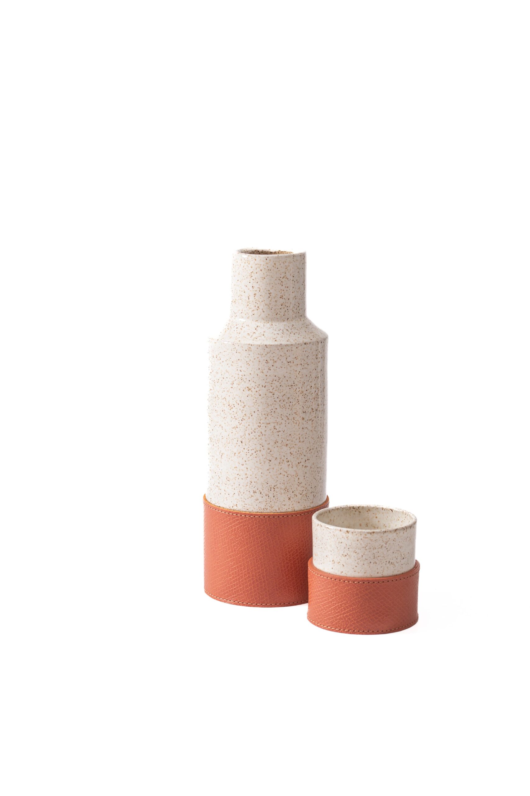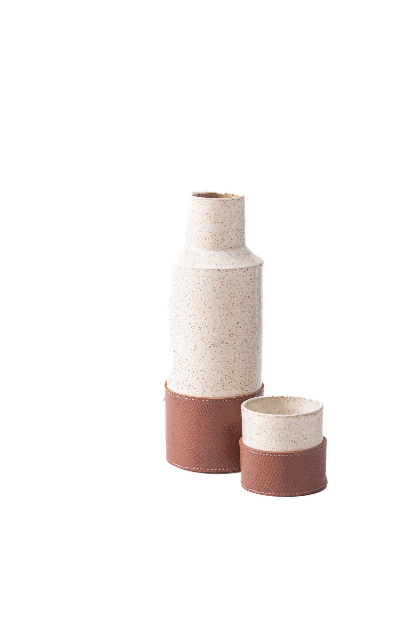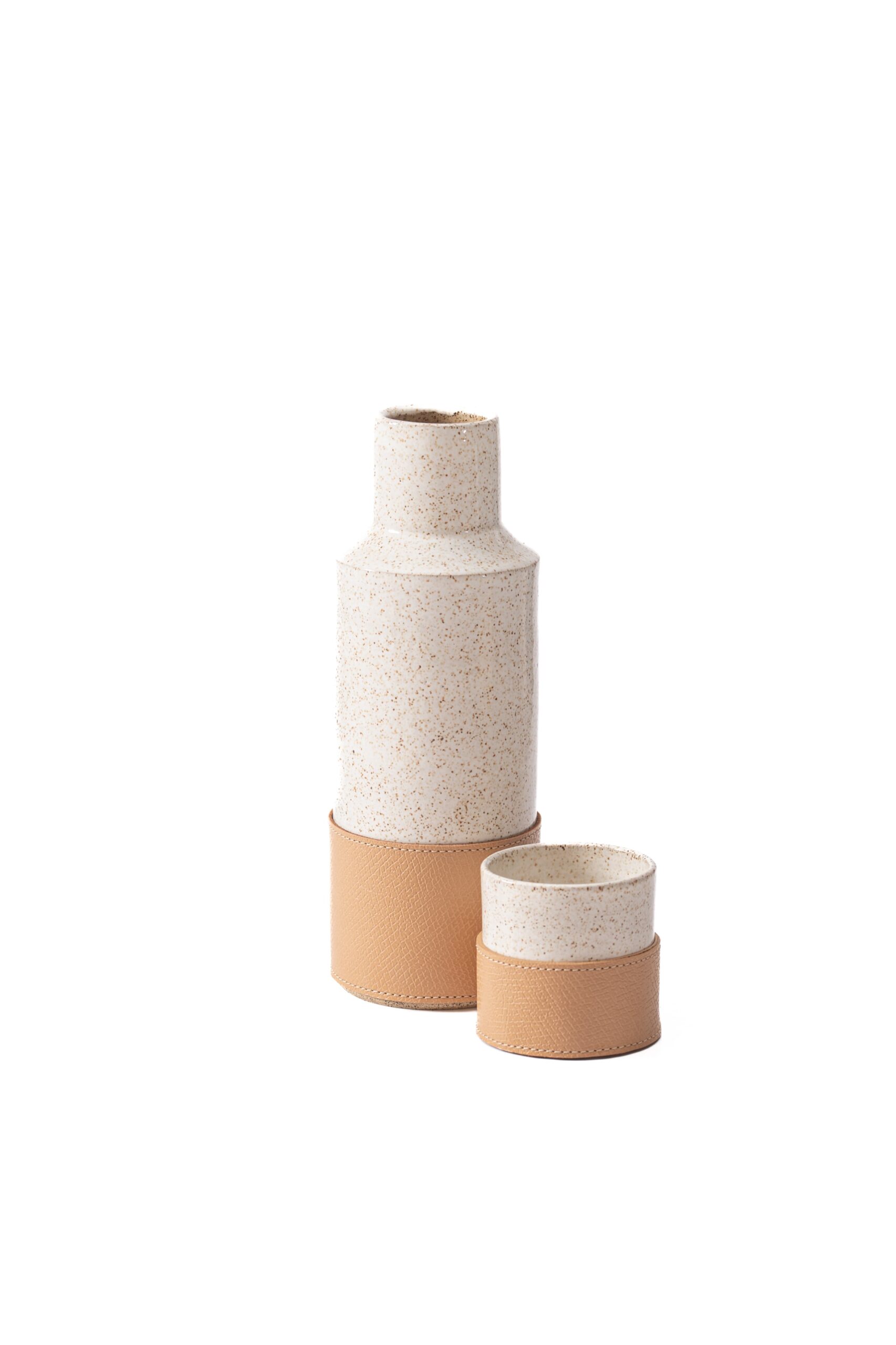 Moringa de cerâmica e capa em couro natural removível. Já acompanha o copo com base em couro que se encaixa perfeitamente na moringa. Em 5 opções de couro.