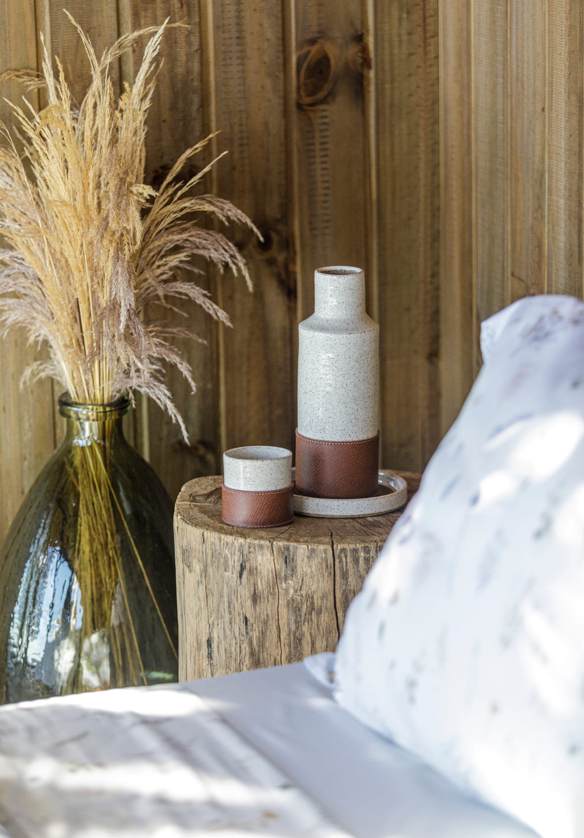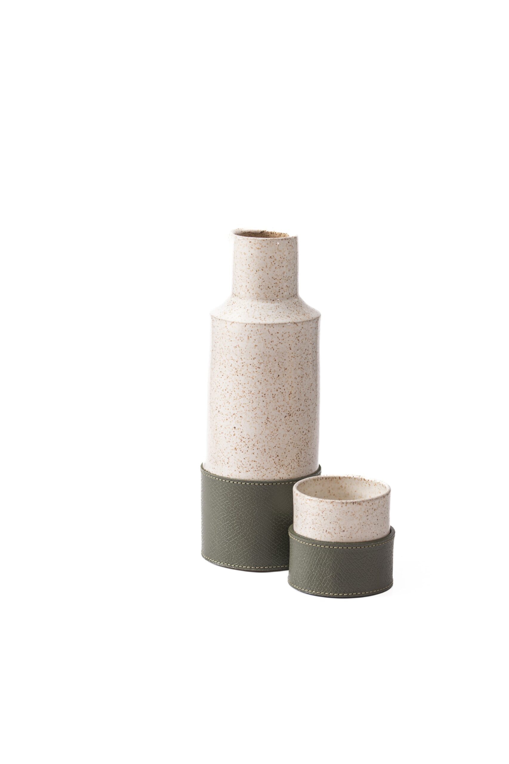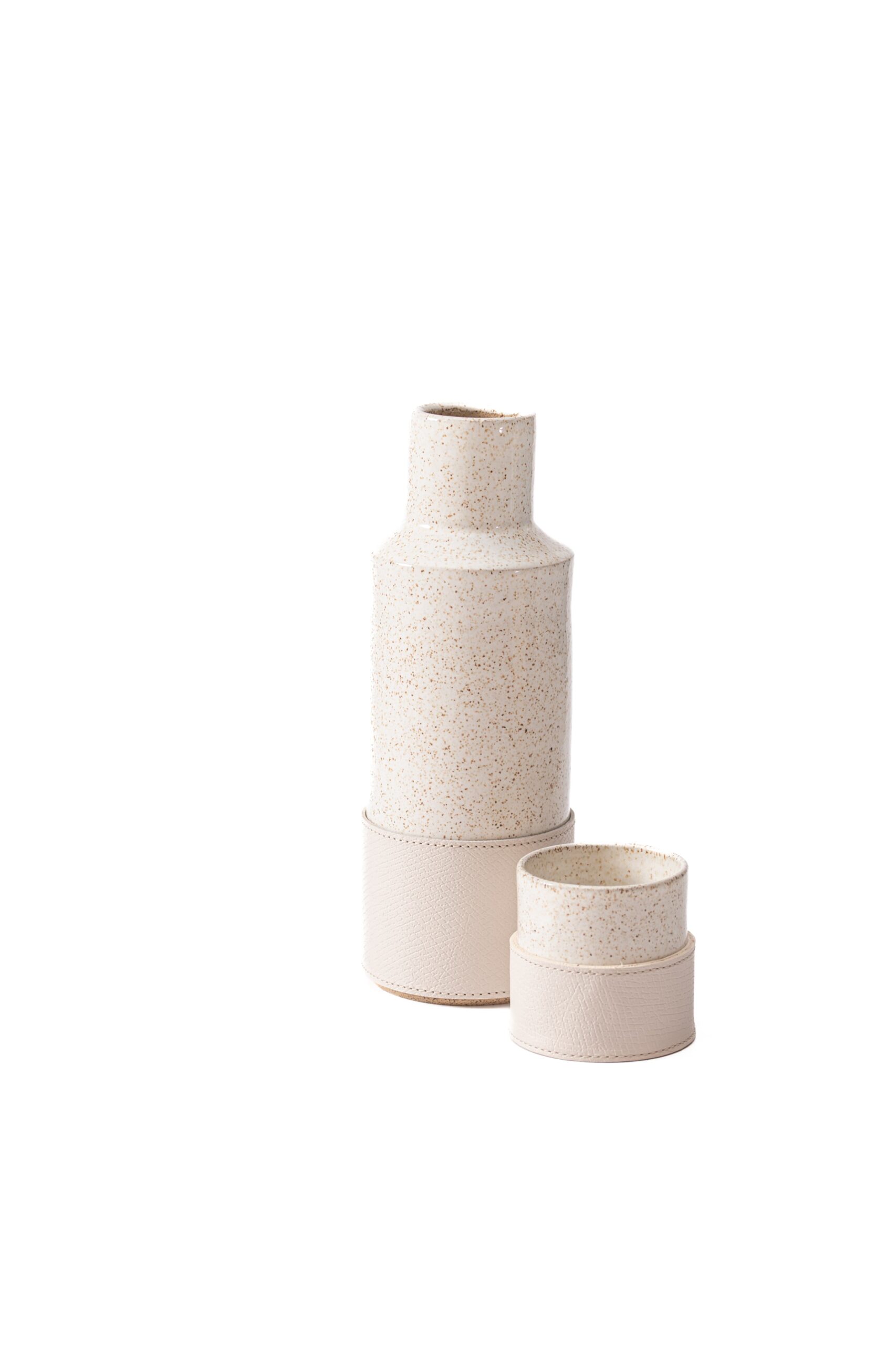 Moringa de cerâmica e capa em couro natural removível. Já acompanha o copo com base em couro que se encaixa perfeitamente na moringa. Em 5 opções de couro.