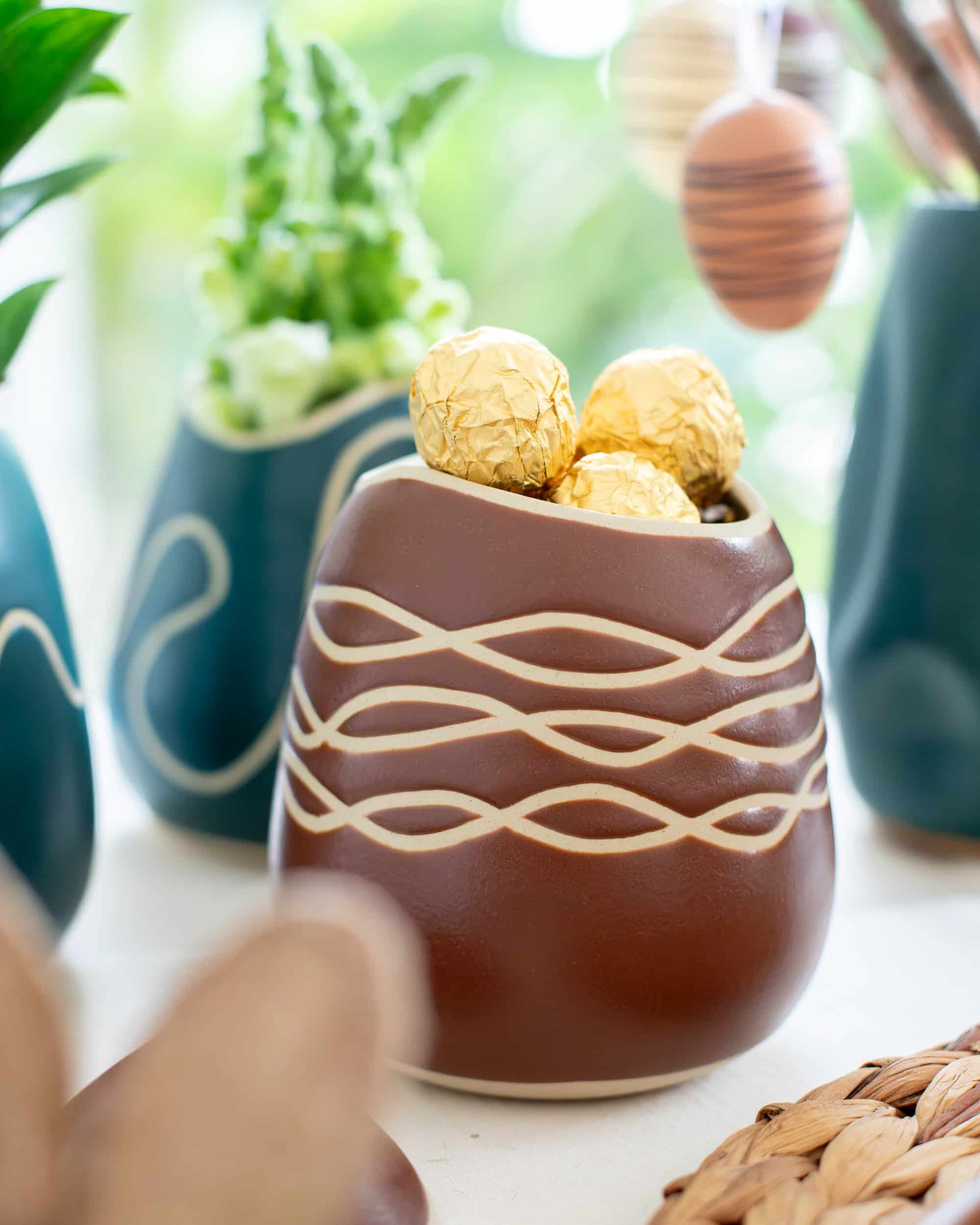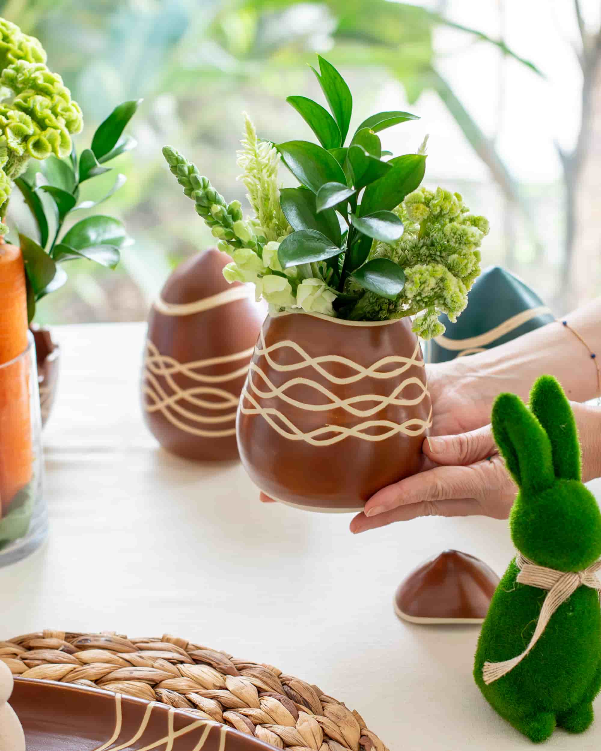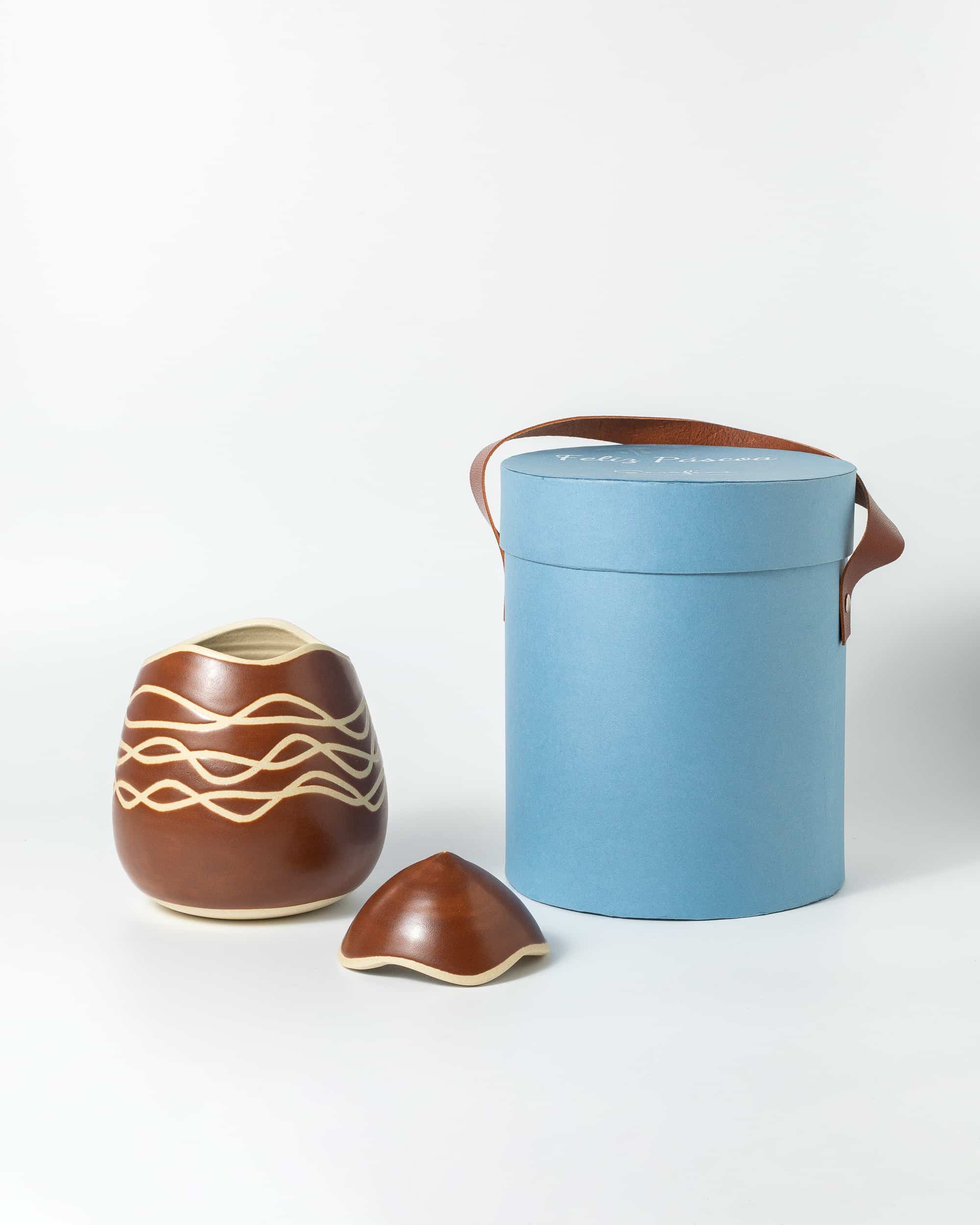 Ovos de Páscoa Serafine. Desenvolvidos para esse ano de 2026 em 2 cores (chocolate e verde mata) e com desenhos orgânicos que tornam cada peça única. E as embalagens, que acompanham cada Ovo de Páscoa, também foram cuidadosamente escolhidas. Peças para presentear nessa data especial e que podem servir também como vaso de flores, porta chocolates, porta canetas e para guardar cápsulas de café.