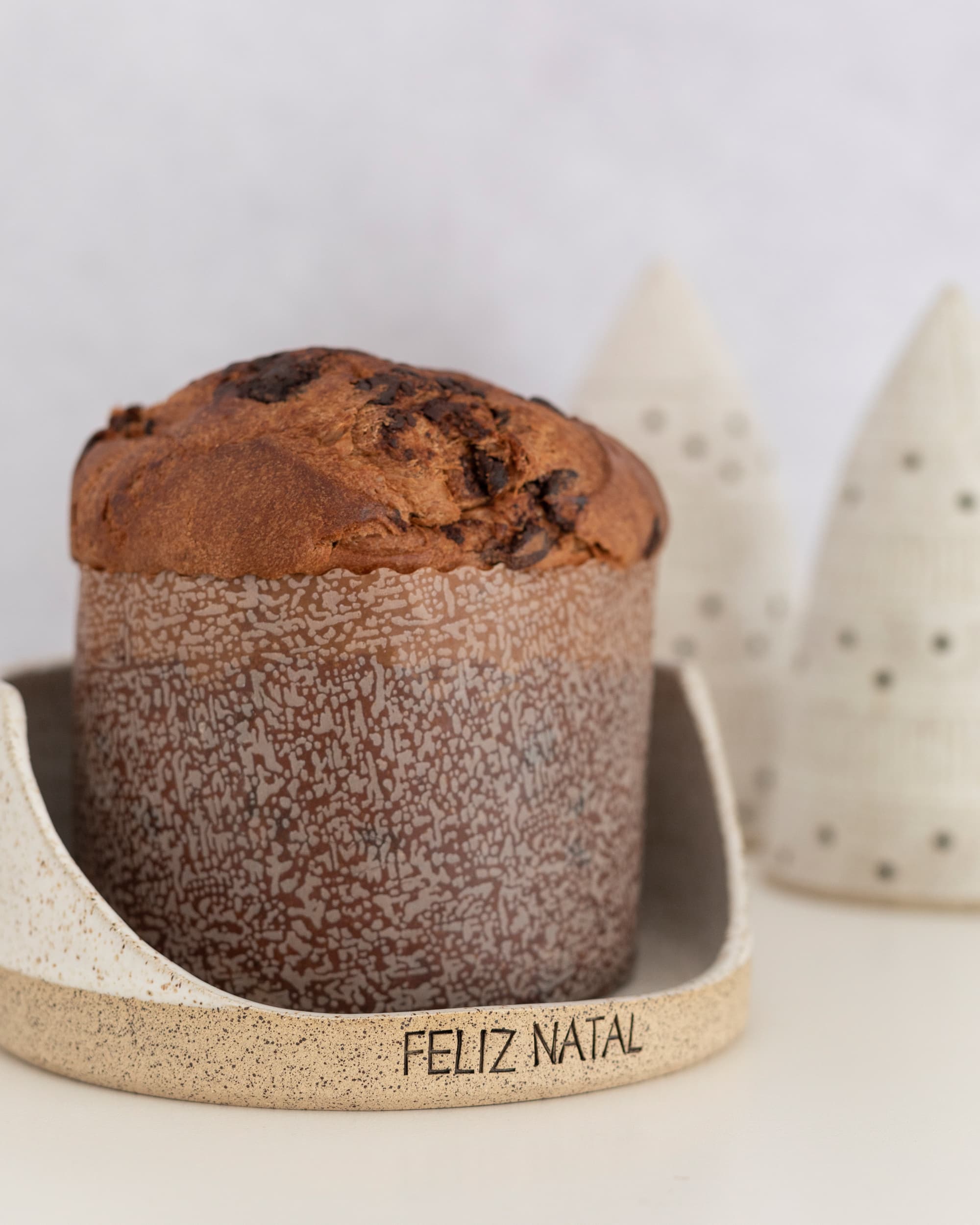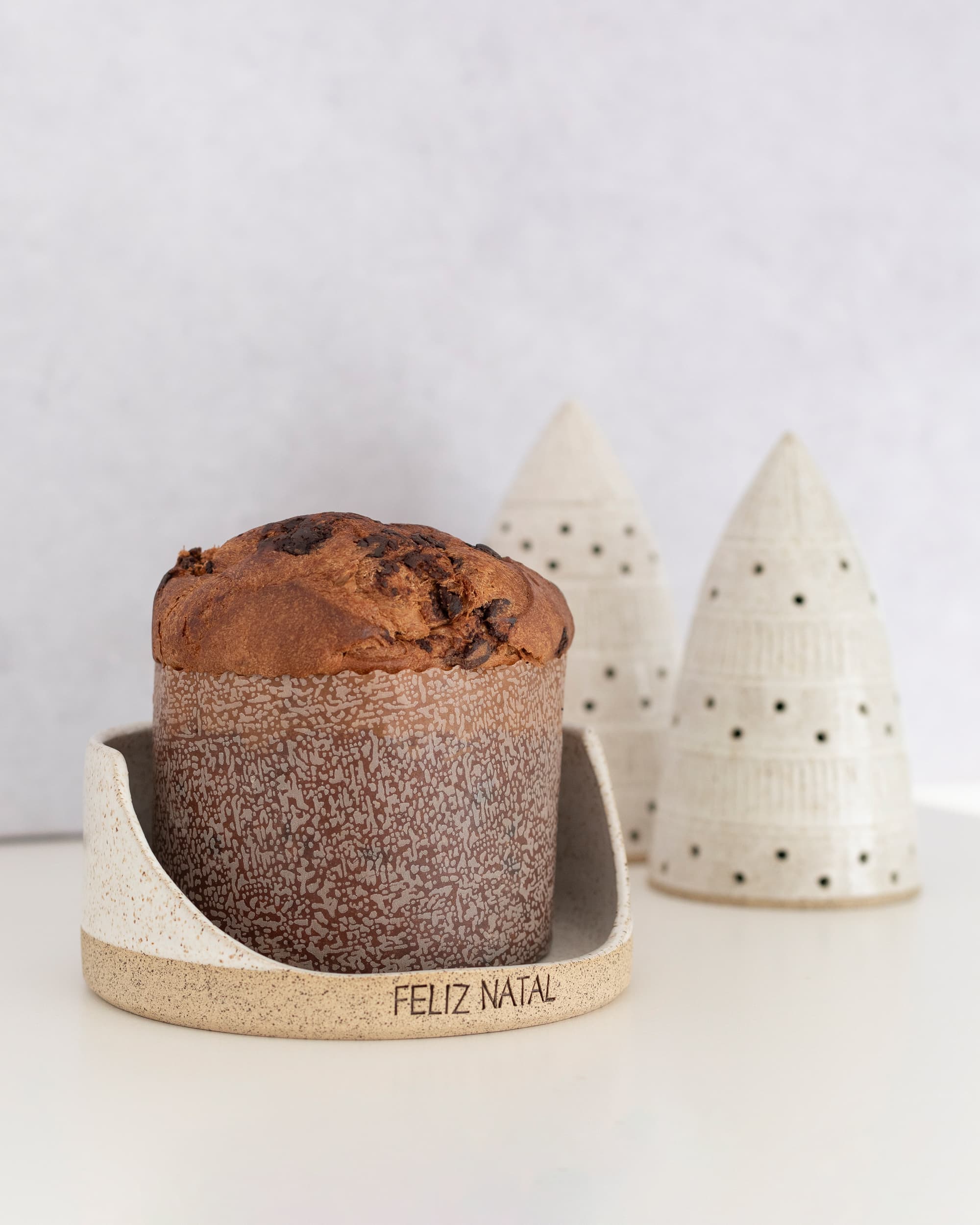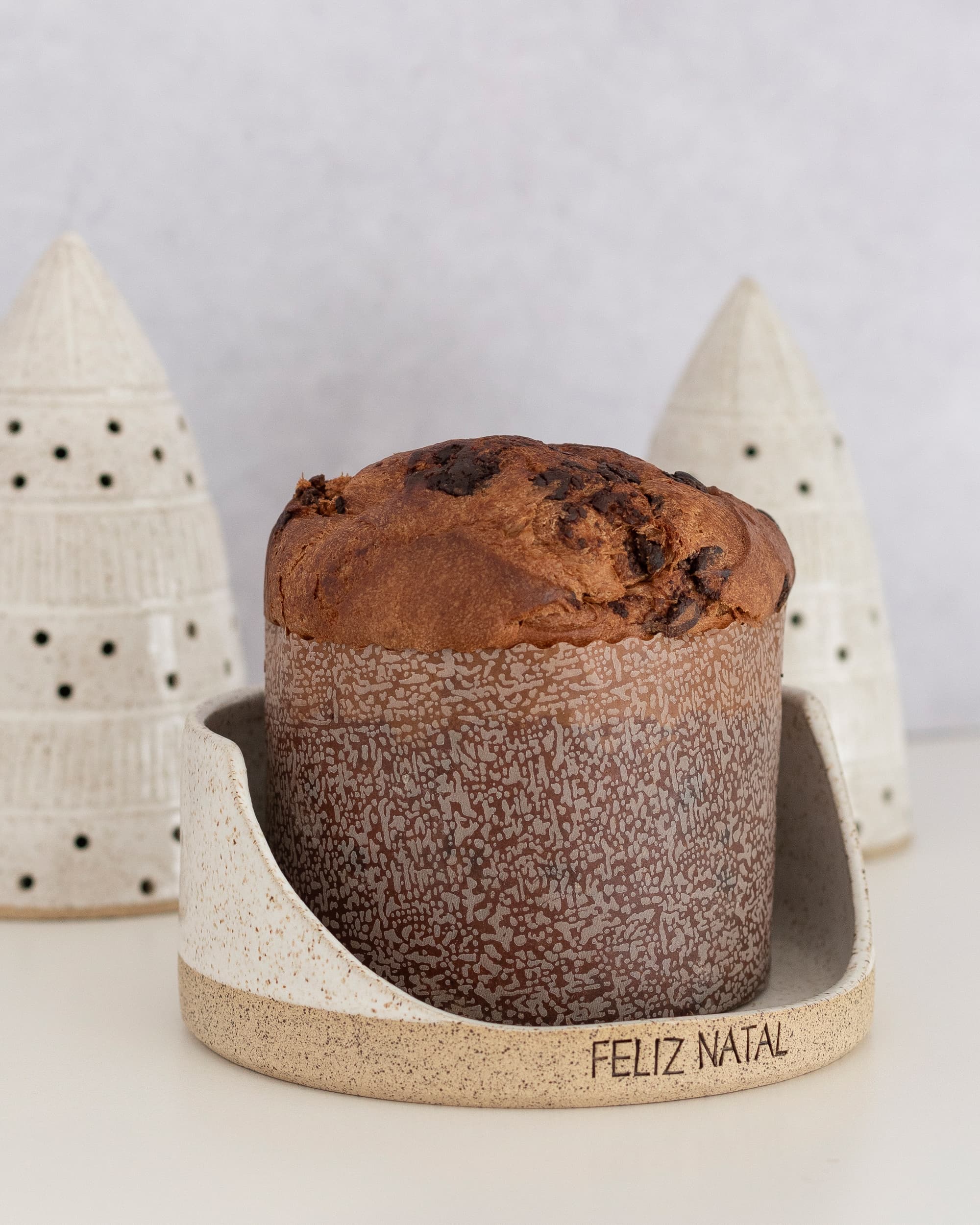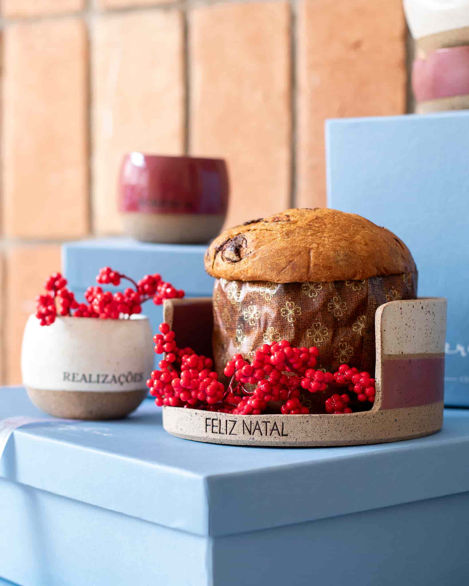 Para dar um charme todo especial na hora de servir o panetone ou chocotone no natal! Com aplicação de carimbo em baixo relevo “FELIZ NATAL”. Indicada para panetones de até 500gr. Medidas: 17 cm ø e 5,5 cm altura