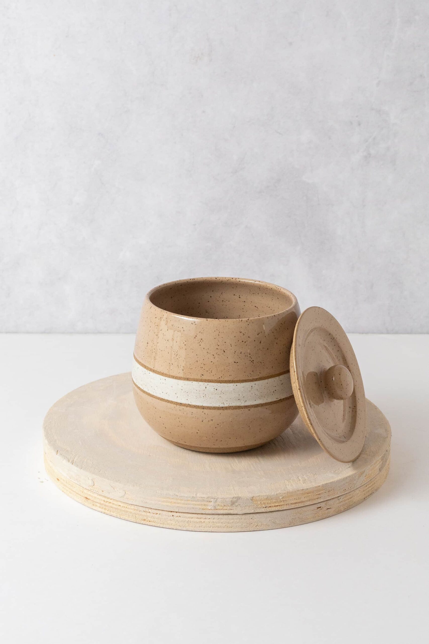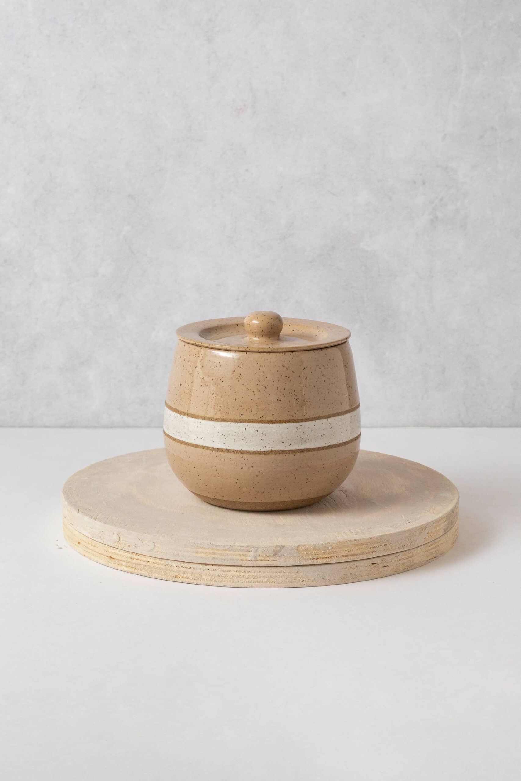 Pote Trancoso com tampa e puxador em tamanho grande. Para organização ou uso decorativo. Como sugestão, bandeja oval para apoio, vendida separadamente.