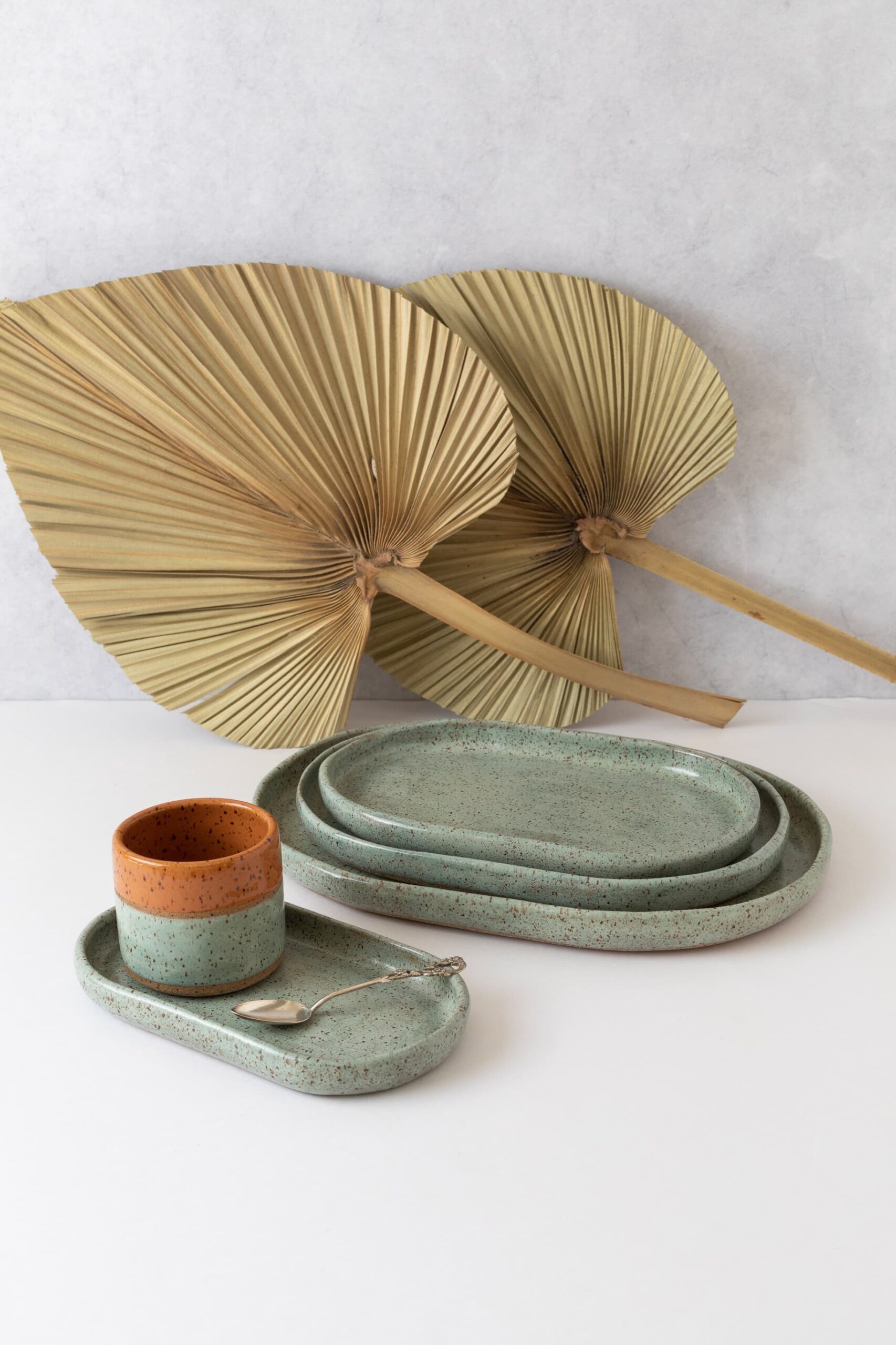 Travessas que acrescentam um toque artesanal a qualquer mesa. Travessas ovais rasas, em quatro tamanhos diferentes, são peças curinga na hora de levar as refeições à mesa ou servir aperitivos. São vendidas separadamente. Uma peça versátil, pode ser usada também como bandeja e ainda para organização ou uso decorativo. Copo vendido separadamente.