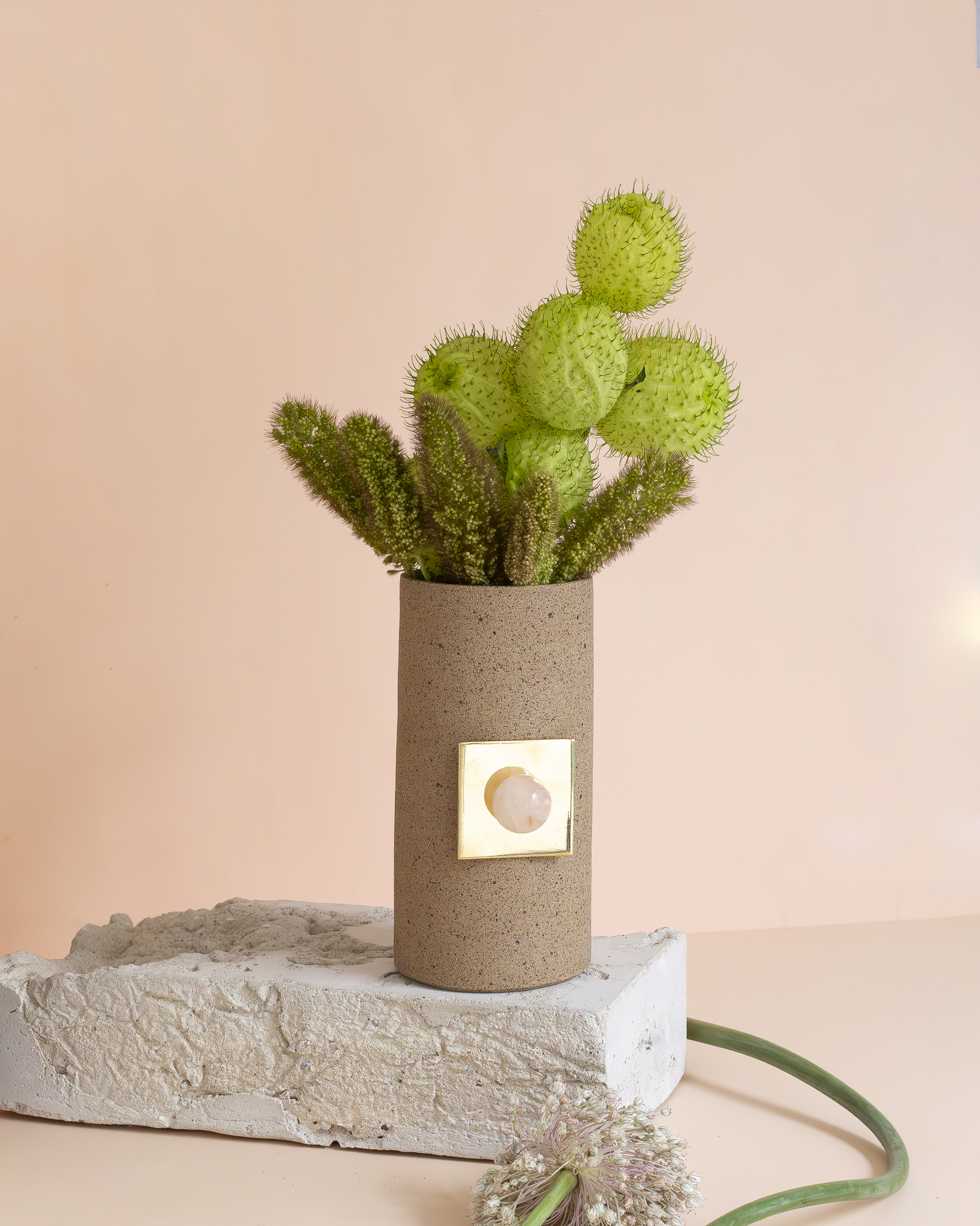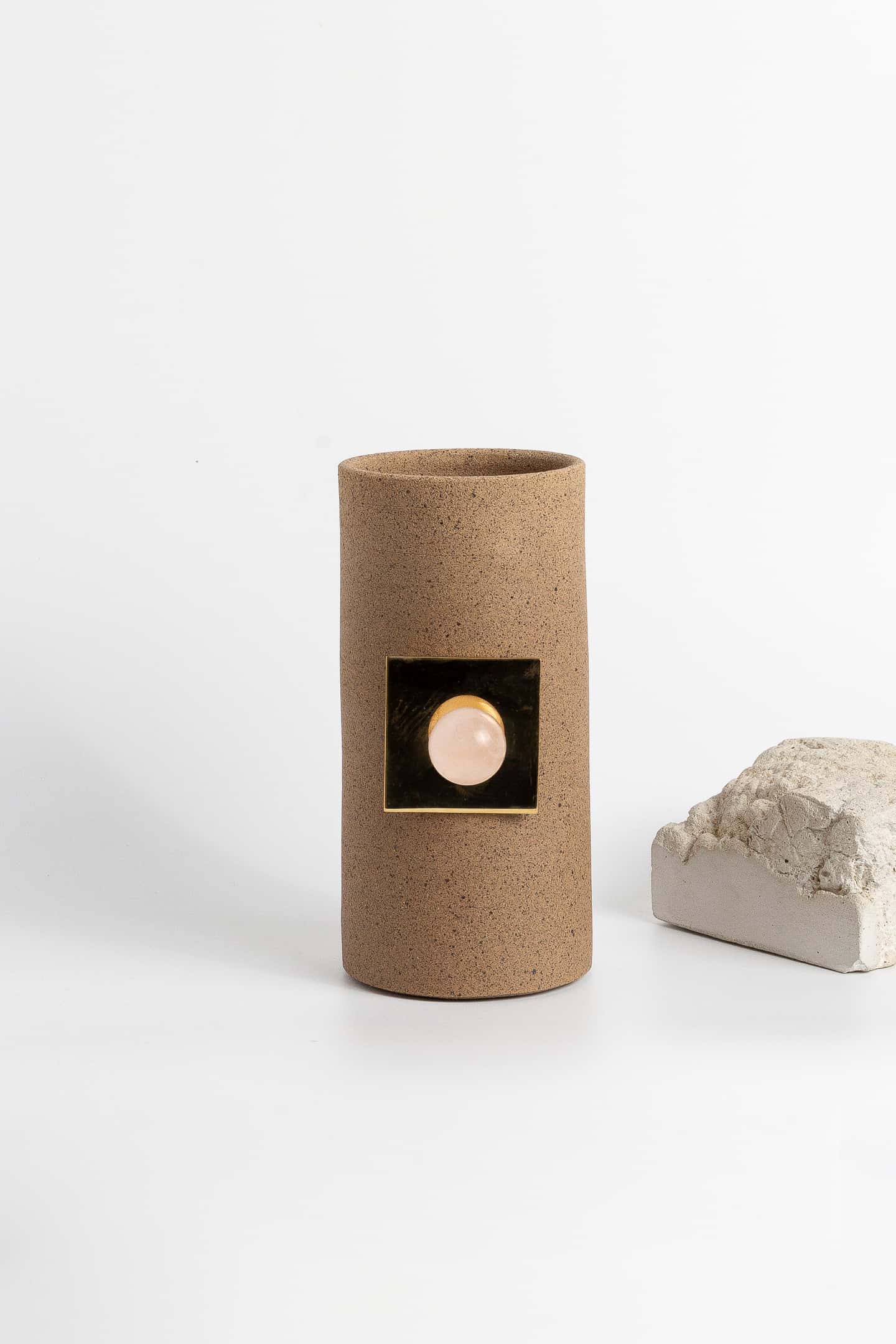 Vaso Althea. Com um design minimalista e uma silhueta cilíndrica elegante, este vaso combina a essência da cerâmica natural com a energia do quartzo rosa, delicadamente aplicada sobre a geometria do latão. Este vaso une arte e natureza em um único objeto, perfeito para valorizar qualquer ambiente.