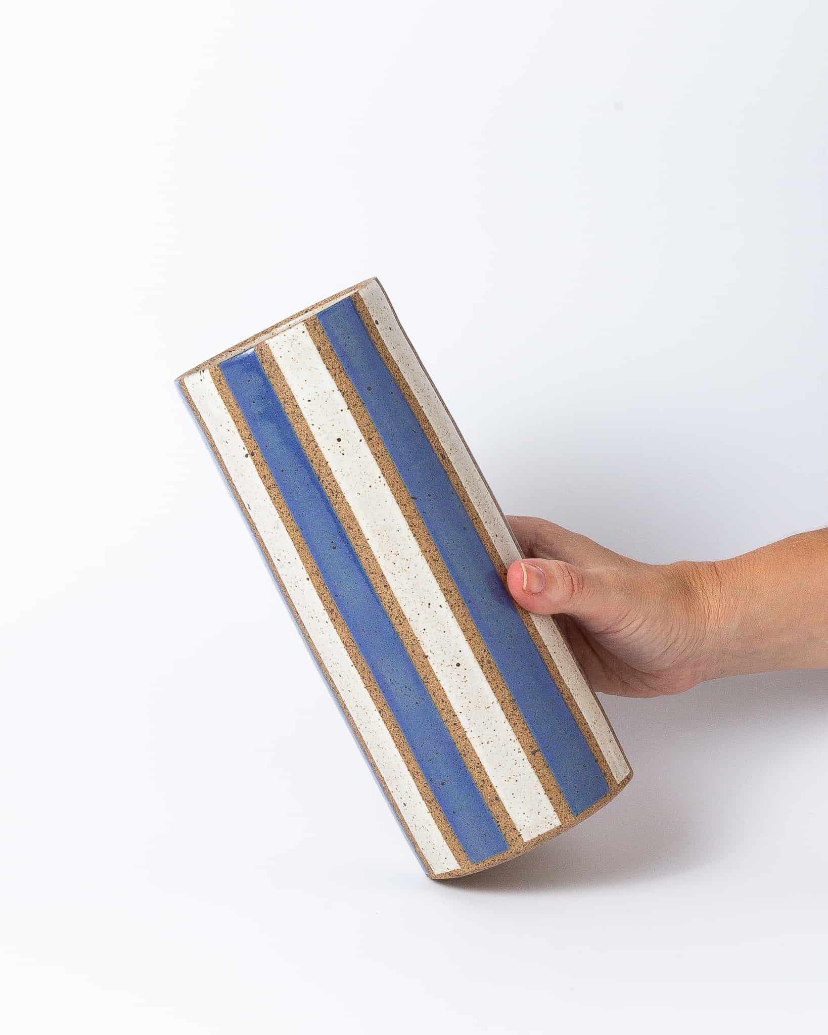 Um design marcante com listras verticais coloridas, separadas por linhas rústicas que deixam a textura do barro aparente, revelando a essência artesanal da peça. Versátil e atemporal, ele pode ser usado como vaso decorativo, suporte para arranjos florais ou simplesmente como um objeto de destaque na decoração.