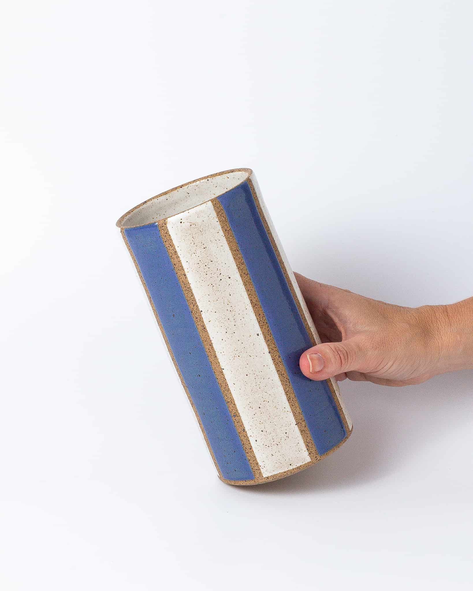 Um design marcante com listras verticais coloridas, separadas por linhas rústicas que deixam a textura do barro aparente, revelando a essência artesanal da peça. Versátil e atemporal, ele pode ser usado como vaso decorativo, suporte para arranjos florais ou simplesmente como um objeto de destaque na decoração.