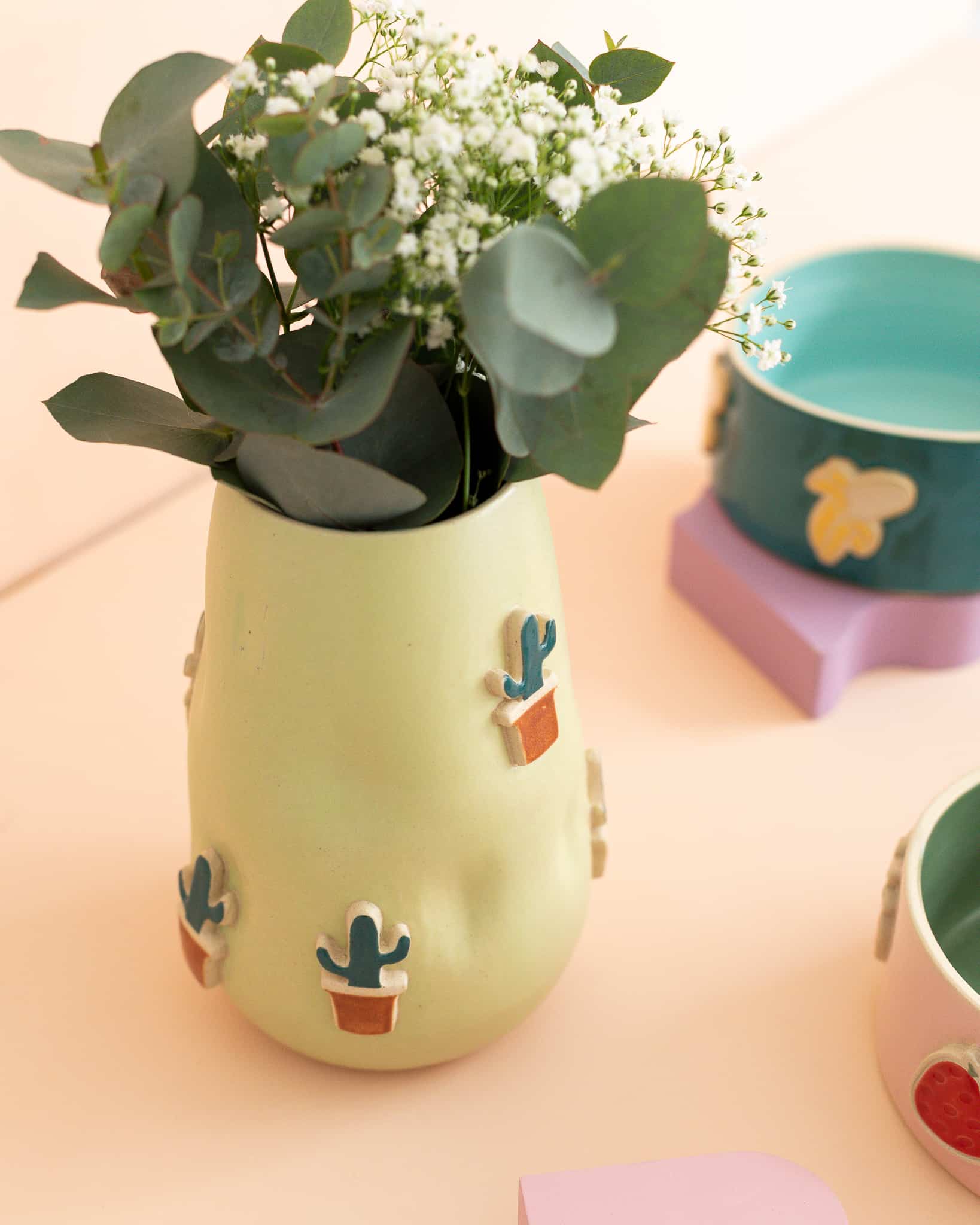 Vaso com cactos em alto relevo. Com formato orgânico e acabamento acetinado, o Vaso Cactus traz pequenos cactos em alto-relevo aplicados manualmente por toda a peça. A combinação entre o verde suave e os detalhes coloridos cria um efeito visual divertido e delicado ao mesmo tempo — perfeito para quem gosta de composições afetivas e cheias de personalidade.