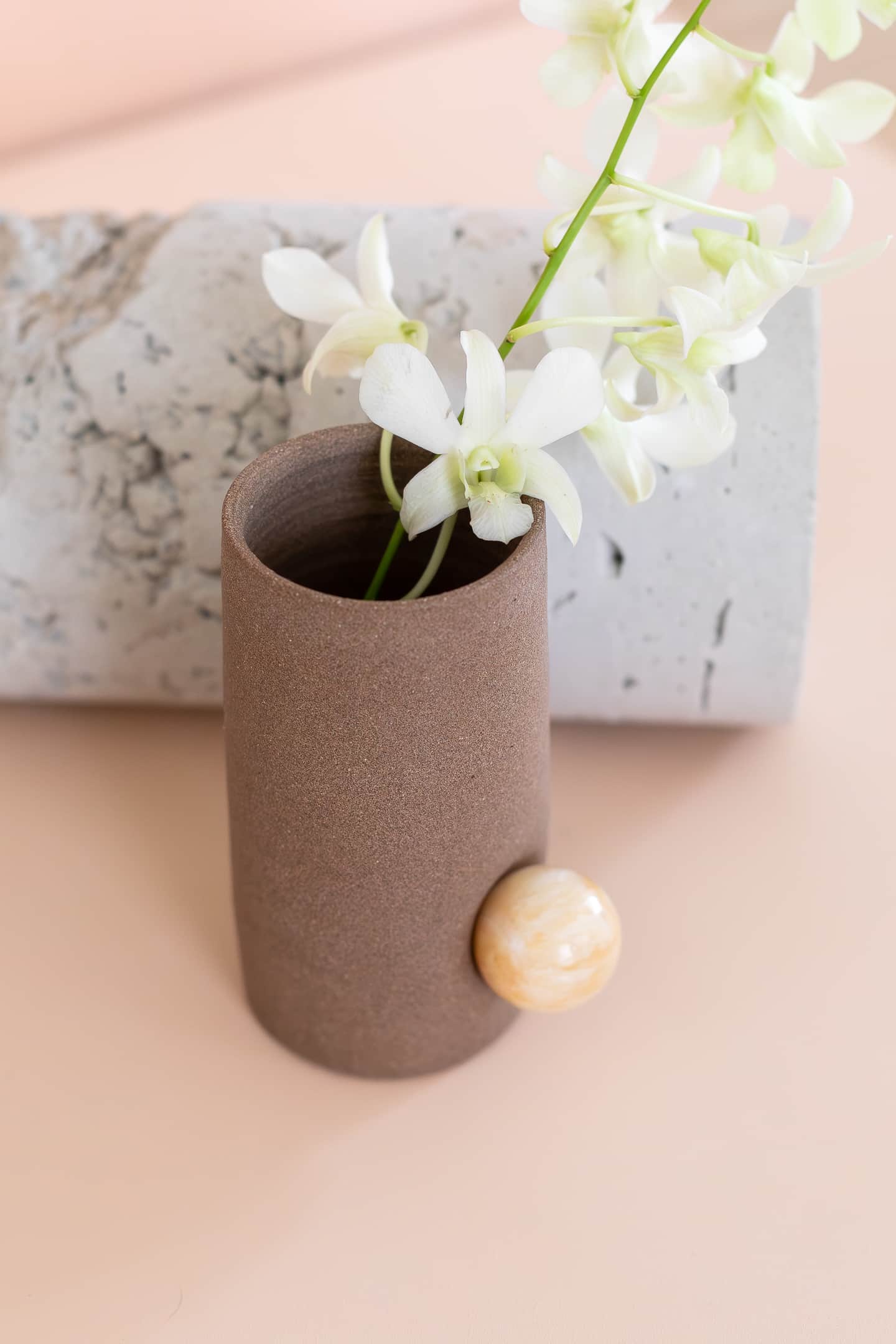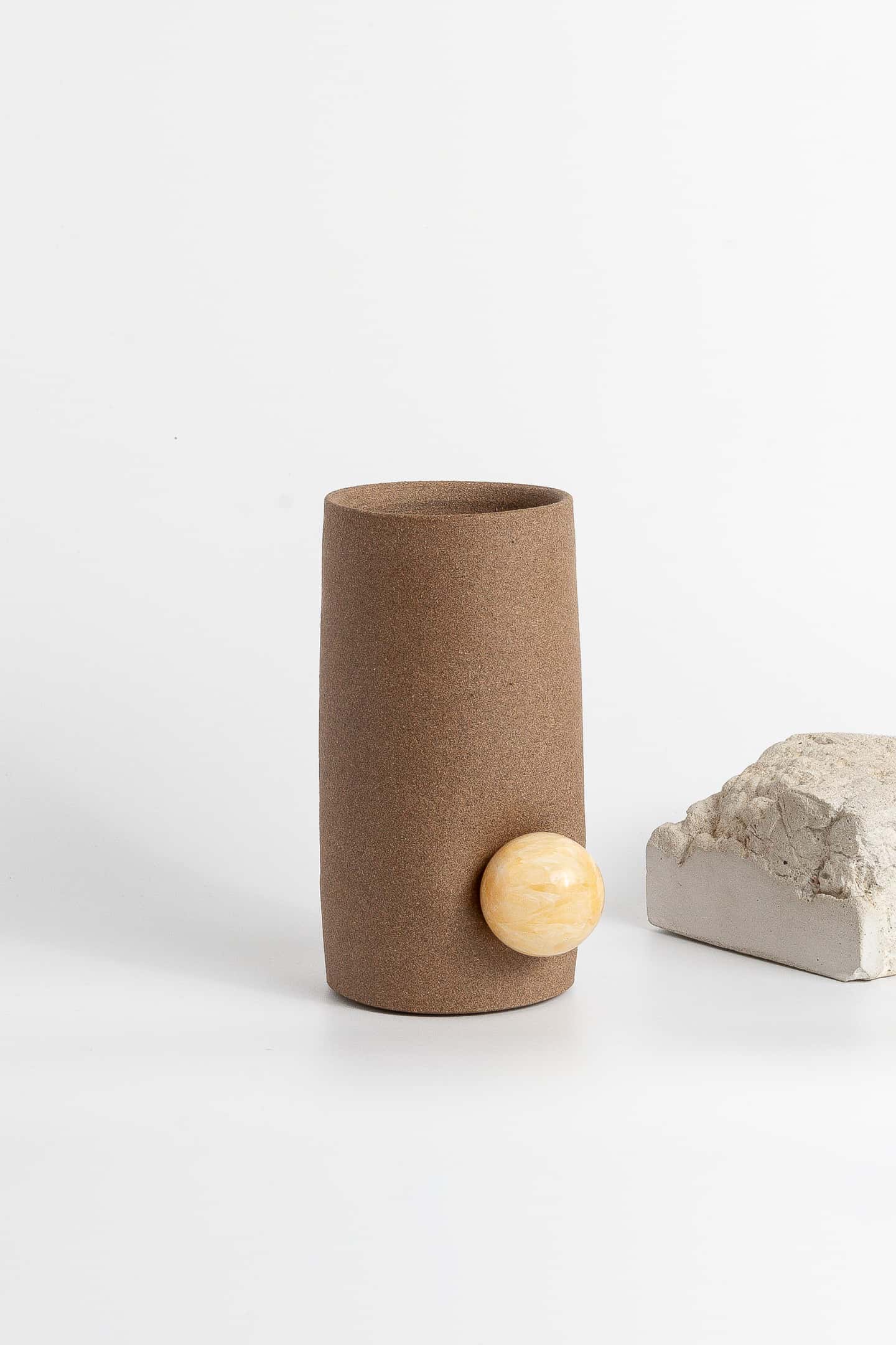 Vaso Celina. Com um design minimalista e uma silhueta cilíndrica elegante, este vaso combina a essência da cerâmica artesanal com a energia da calcita amarela, posicionada estrategicamente, adicionando um ponto de destaque evocando equilíbrio e sofisticação. Ideal para composições contemporâneas, este vaso une arte e natureza em um único objeto, perfeito para valorizar qualquer ambiente.