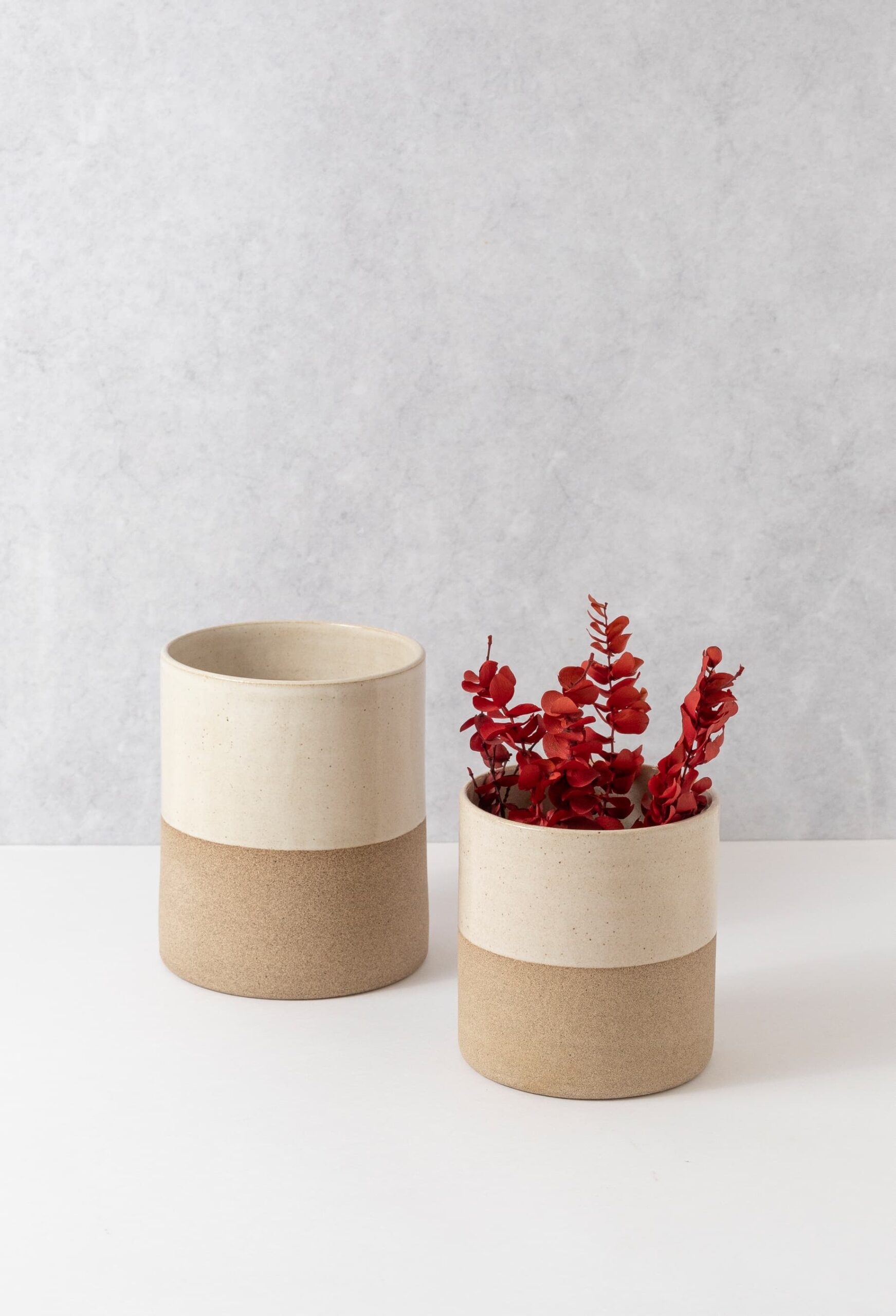 Vaso em cerâmica em formato cilindrico. Em três tamanhos diferentes.