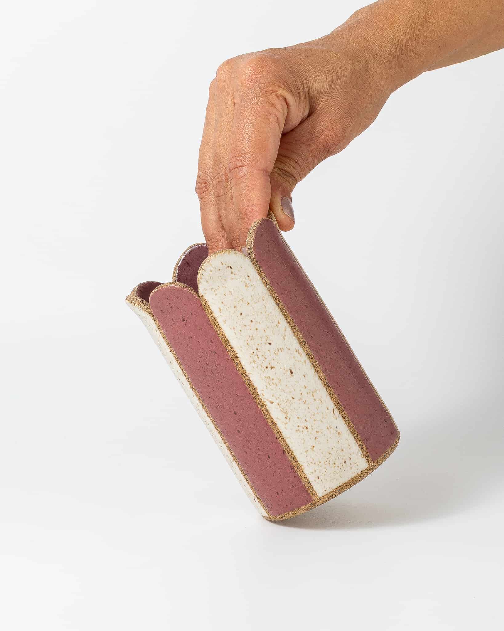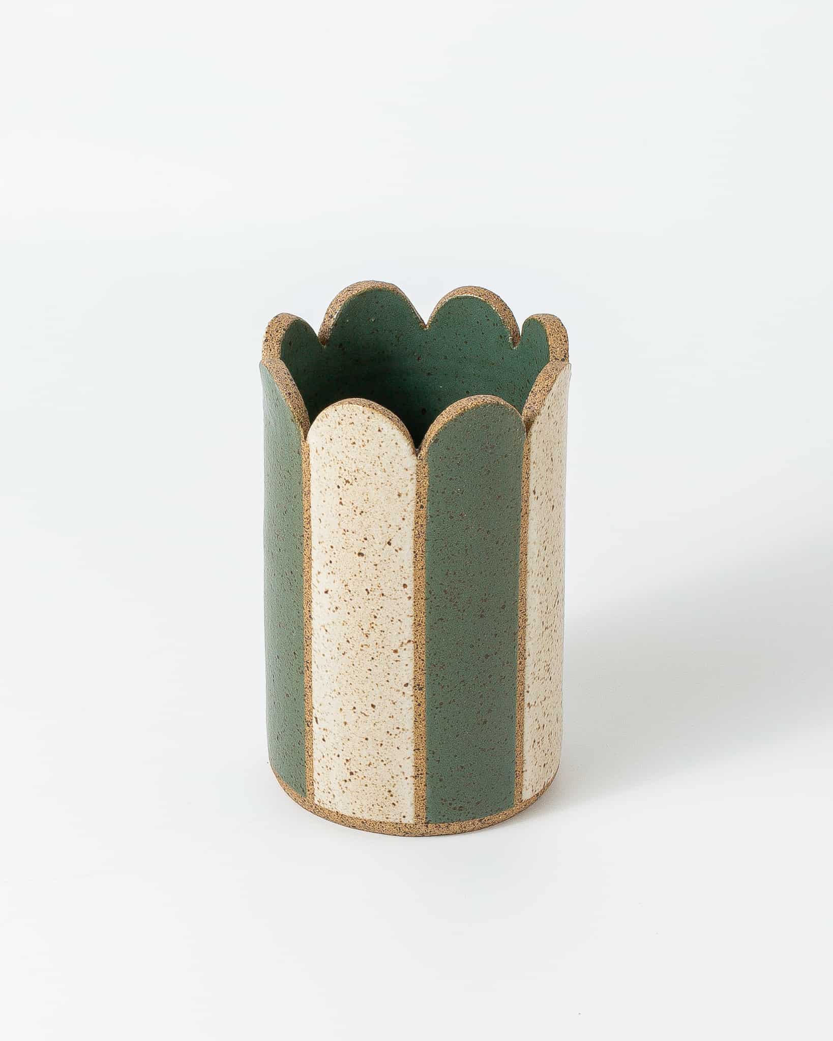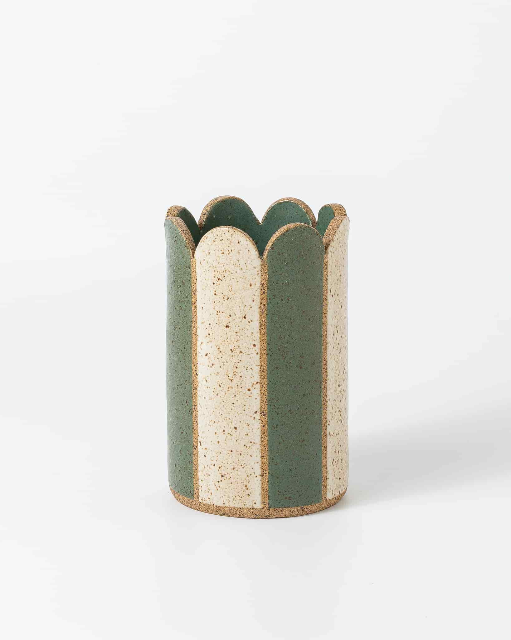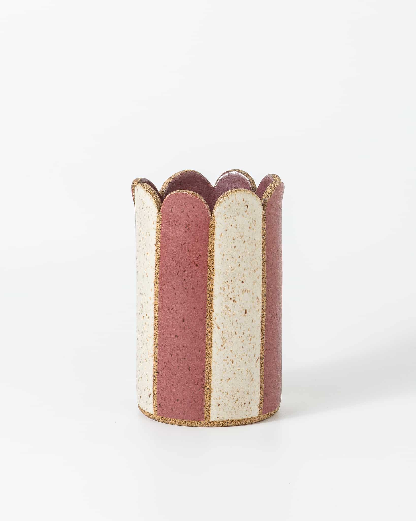 Com formato cilíndrico e bordas onduladas, o vaso Raia P combina linhas verticais marcantes e acabamento natural em argila aparente. Ideal para composições com flores médias ou folhagens mais estruturadas.