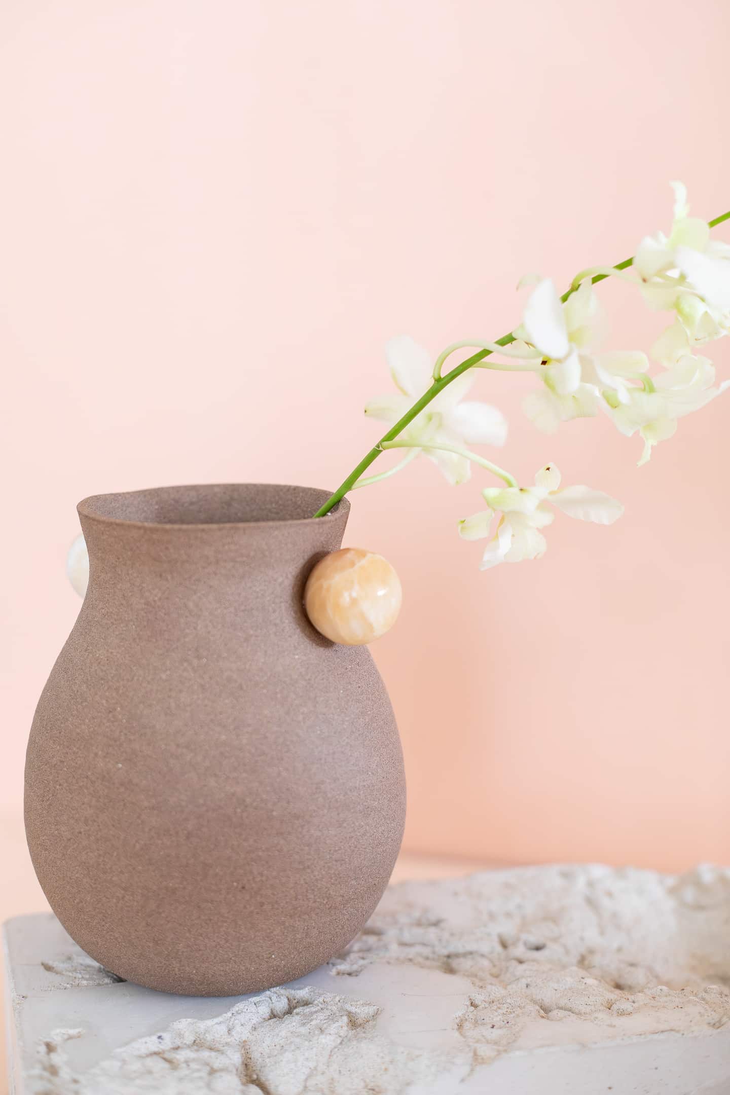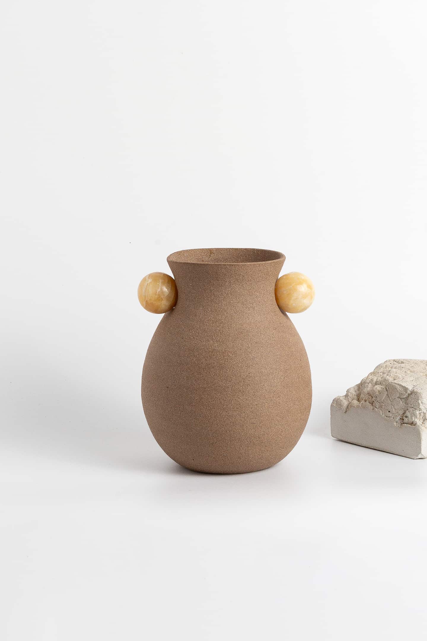Vaso Stella. Com formas arredondadas e textura rústica, este vaso combina a essência da cerâmica artesanal com a energia da calcita amarela, que adiciona um toque luminoso e sofisticado. Perfeito para composições minimalistas ou ambientes que valorizam a beleza dos materiais naturais.