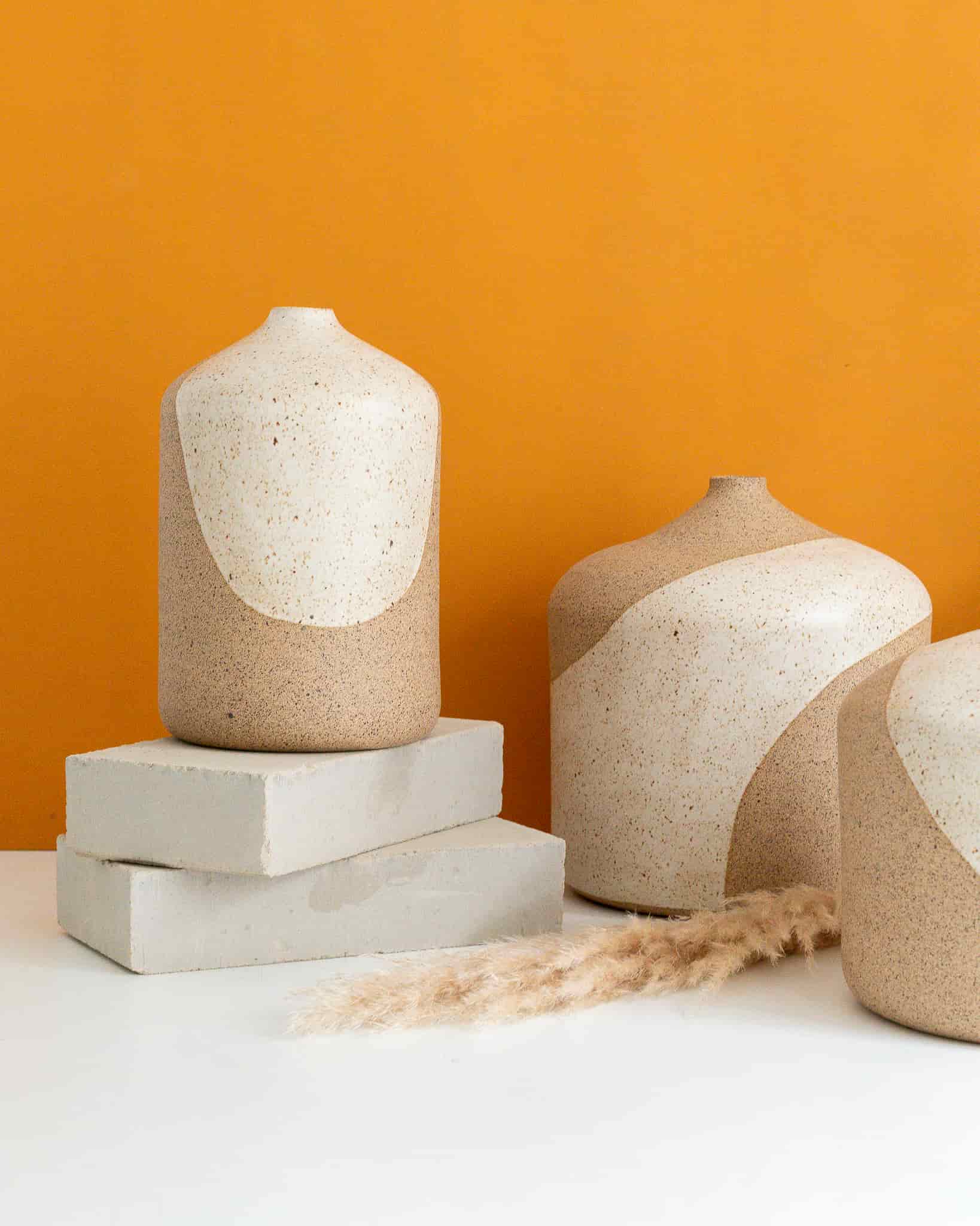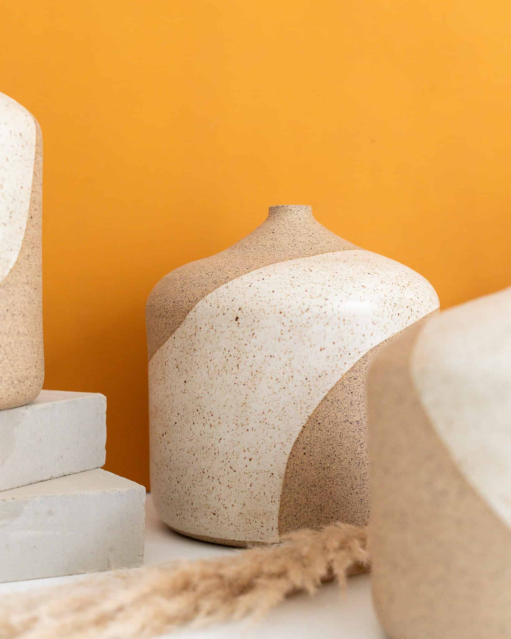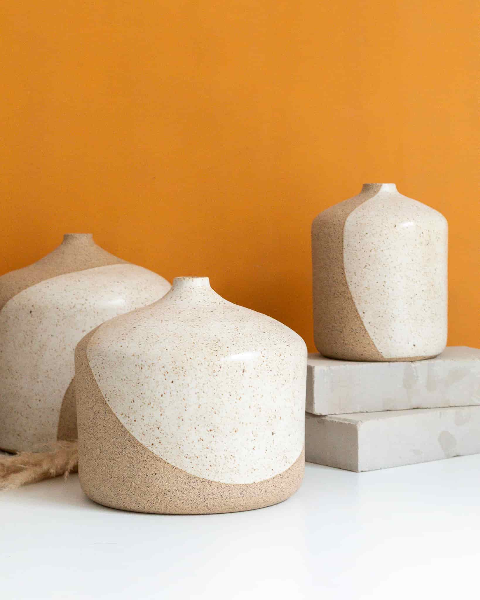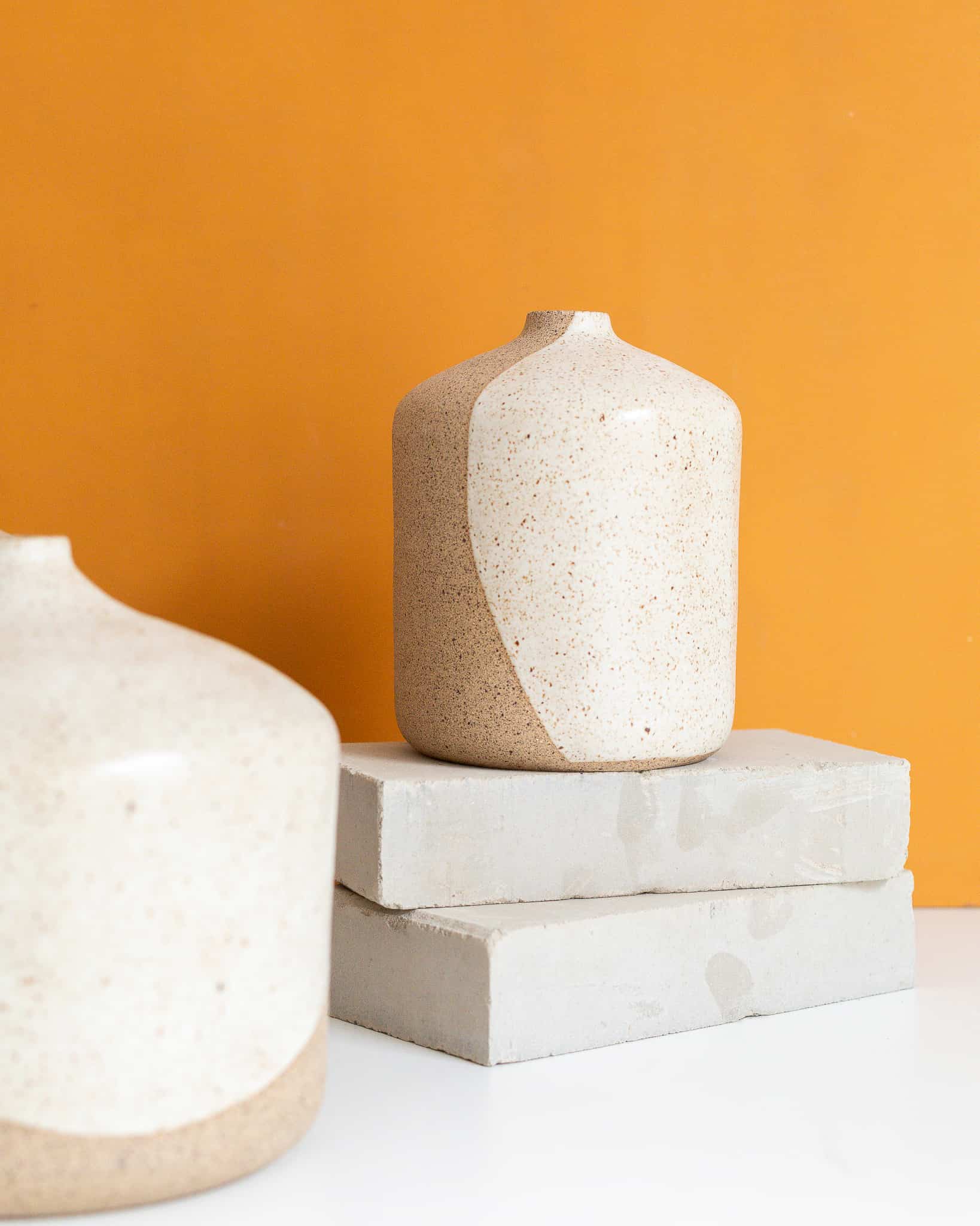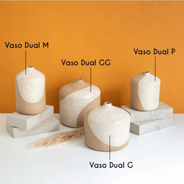 Vaso Dual. Essa coleção traduz o encontro entre argila e esmalte em formas minimalistas e orgânicas. Cada vaso revela o contraste suave entre o natural e o delicado. Em 4 tamanhos diferentes.