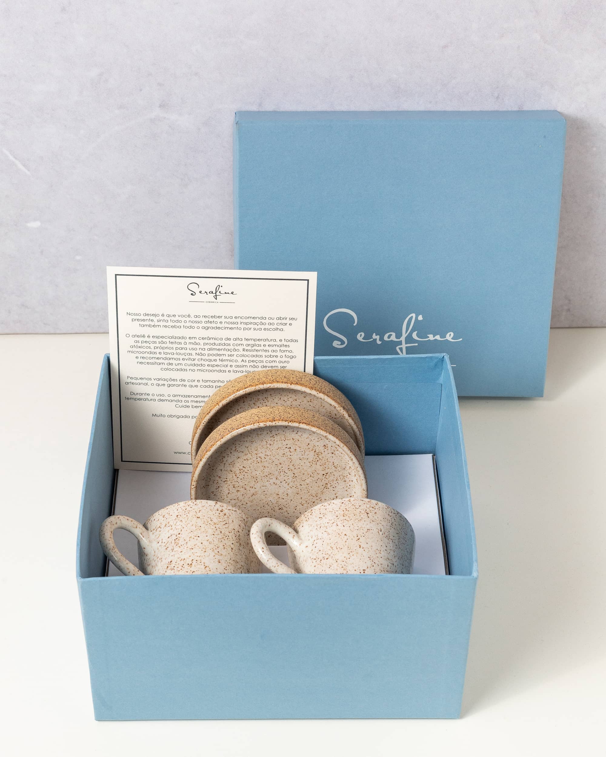 Jogo de 2 xícaras Lisboa com pires borda reta. Num formato charmoso e tamanho especialmente desenvolvido para café curto ou sua bebida favorita. Para servir bebidas quentes ou frias. Nessa linha “Special Gift”, as peças acompanham a caixa de presente personalizada. Para momentos especiais e datas comemorativas ao longo do ano.